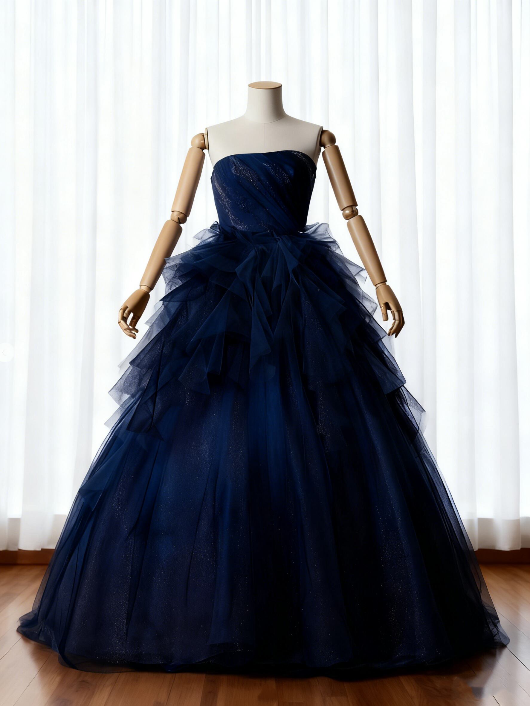 カラードレス ベアトップ キラキラグリッターチュール ラッフルフリル エレガント ネイビー クラシカル