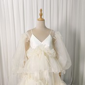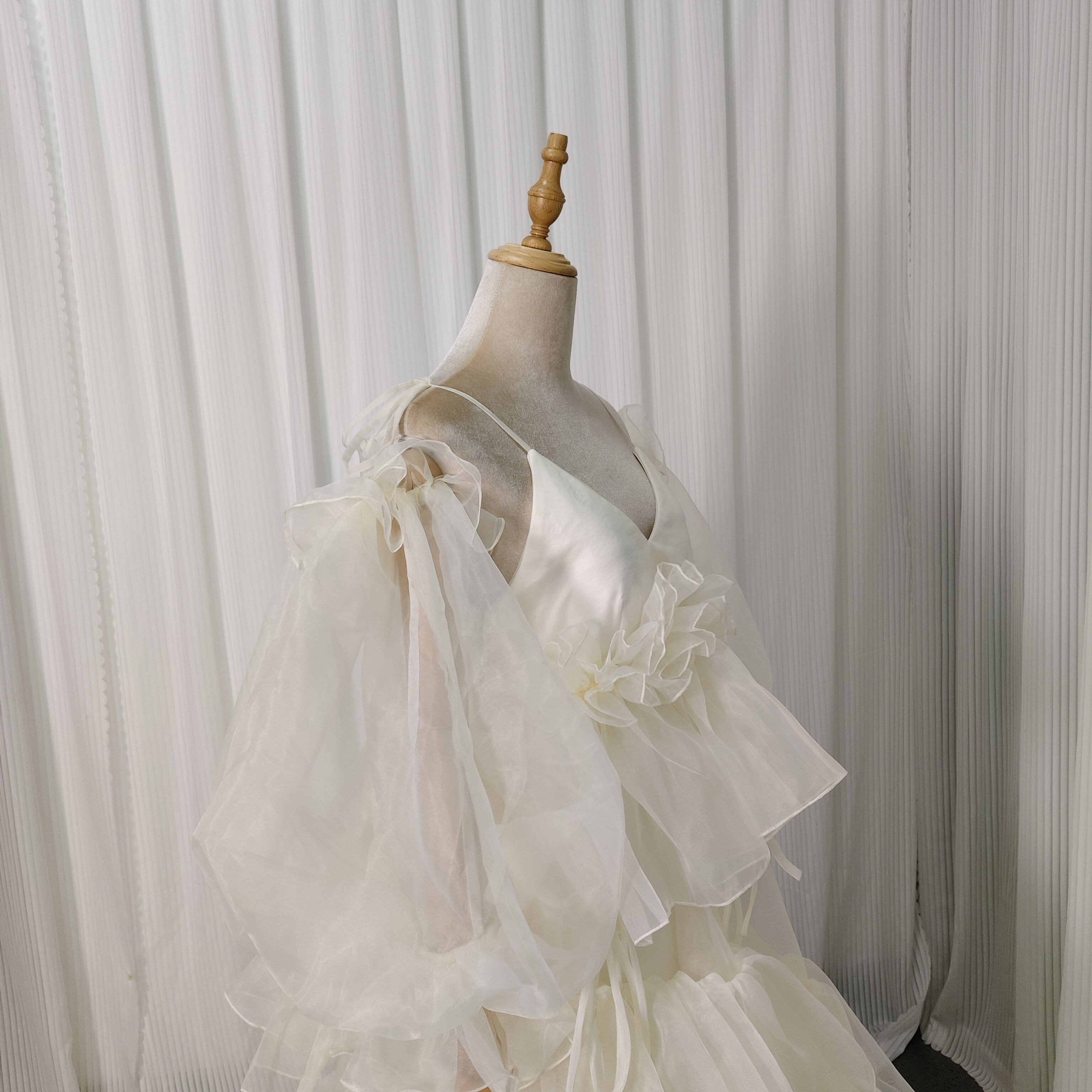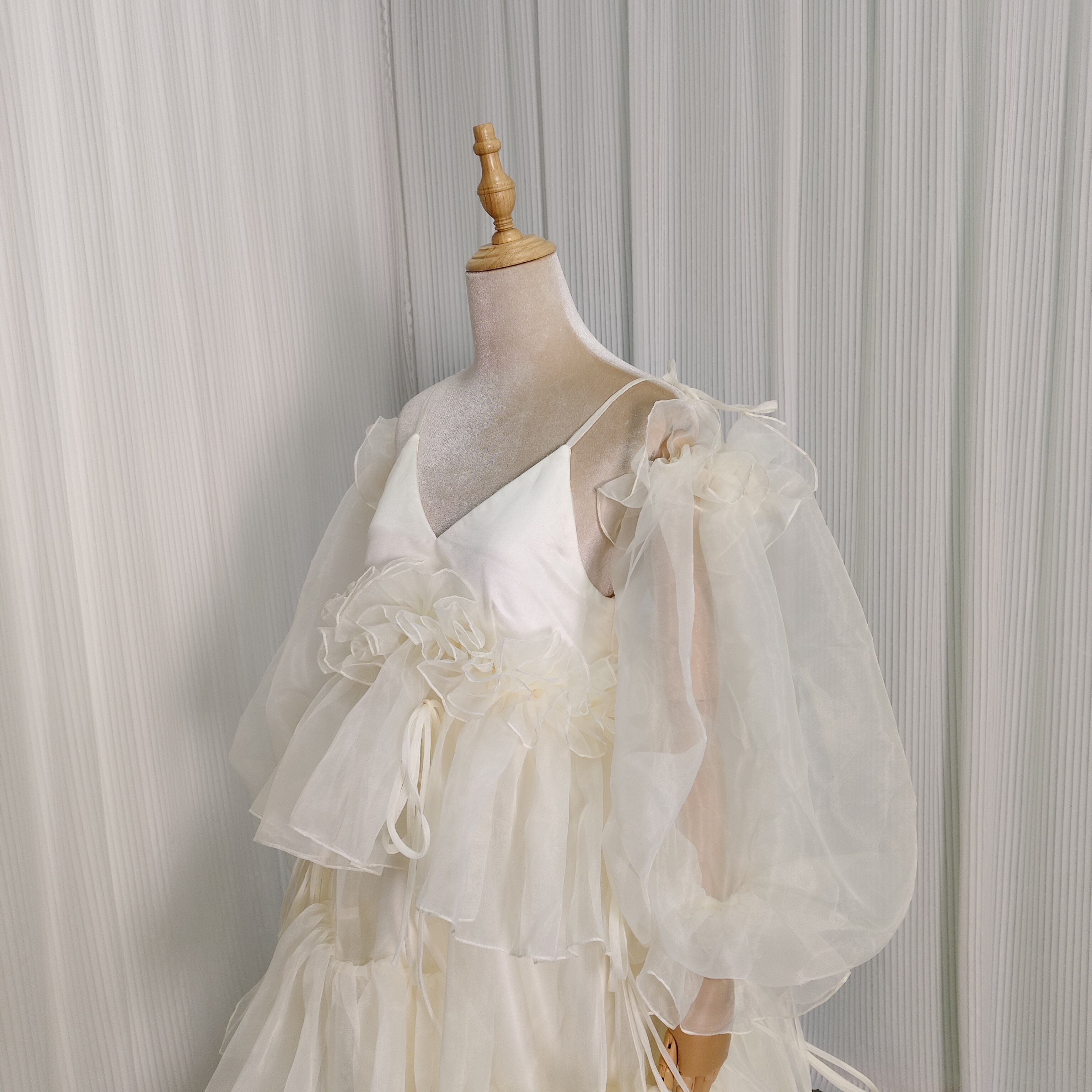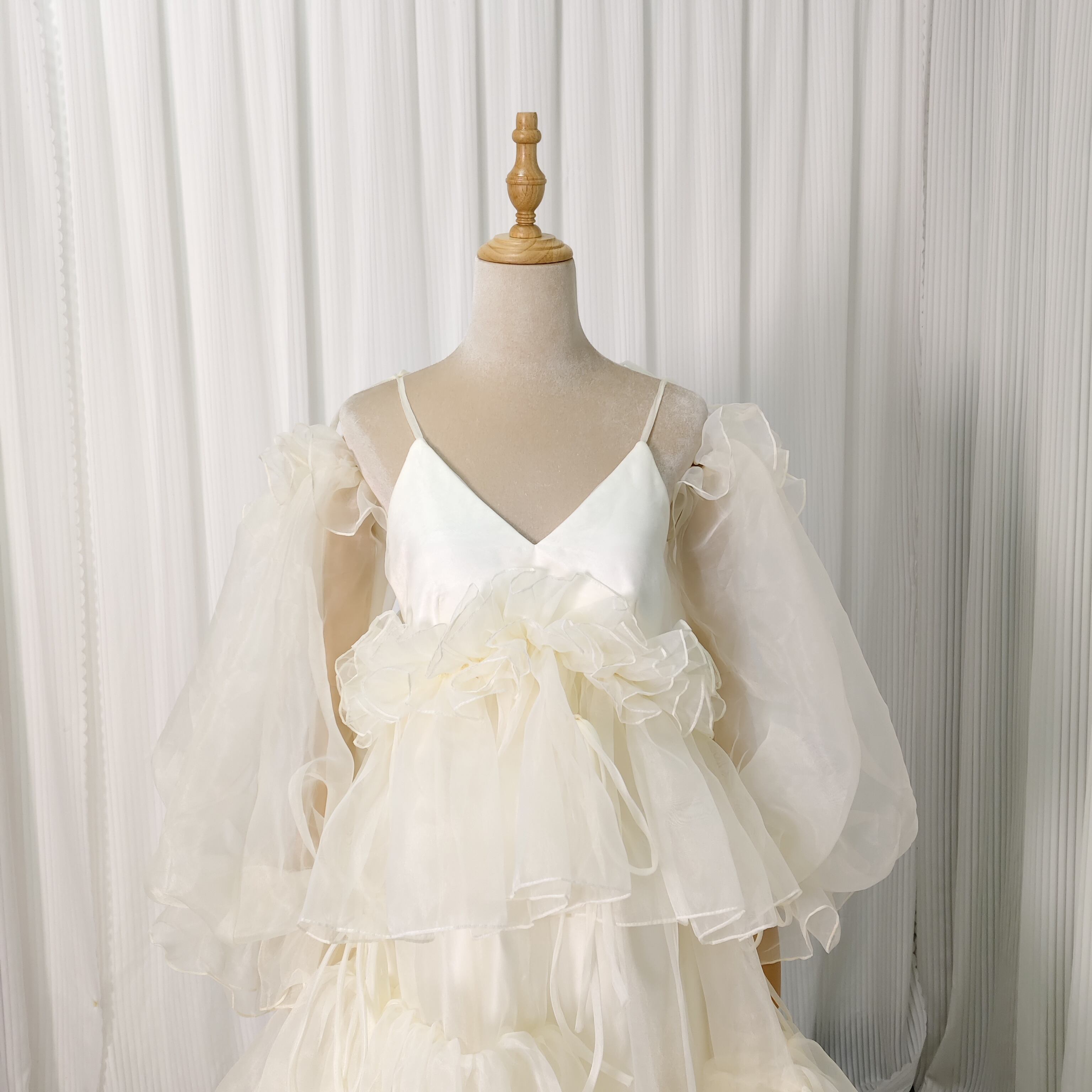 パーティードレス 薄シャンパン色 上質オーガンジー 取り外し可能な付け袖 花嫁 床付く 前撮り 二次会