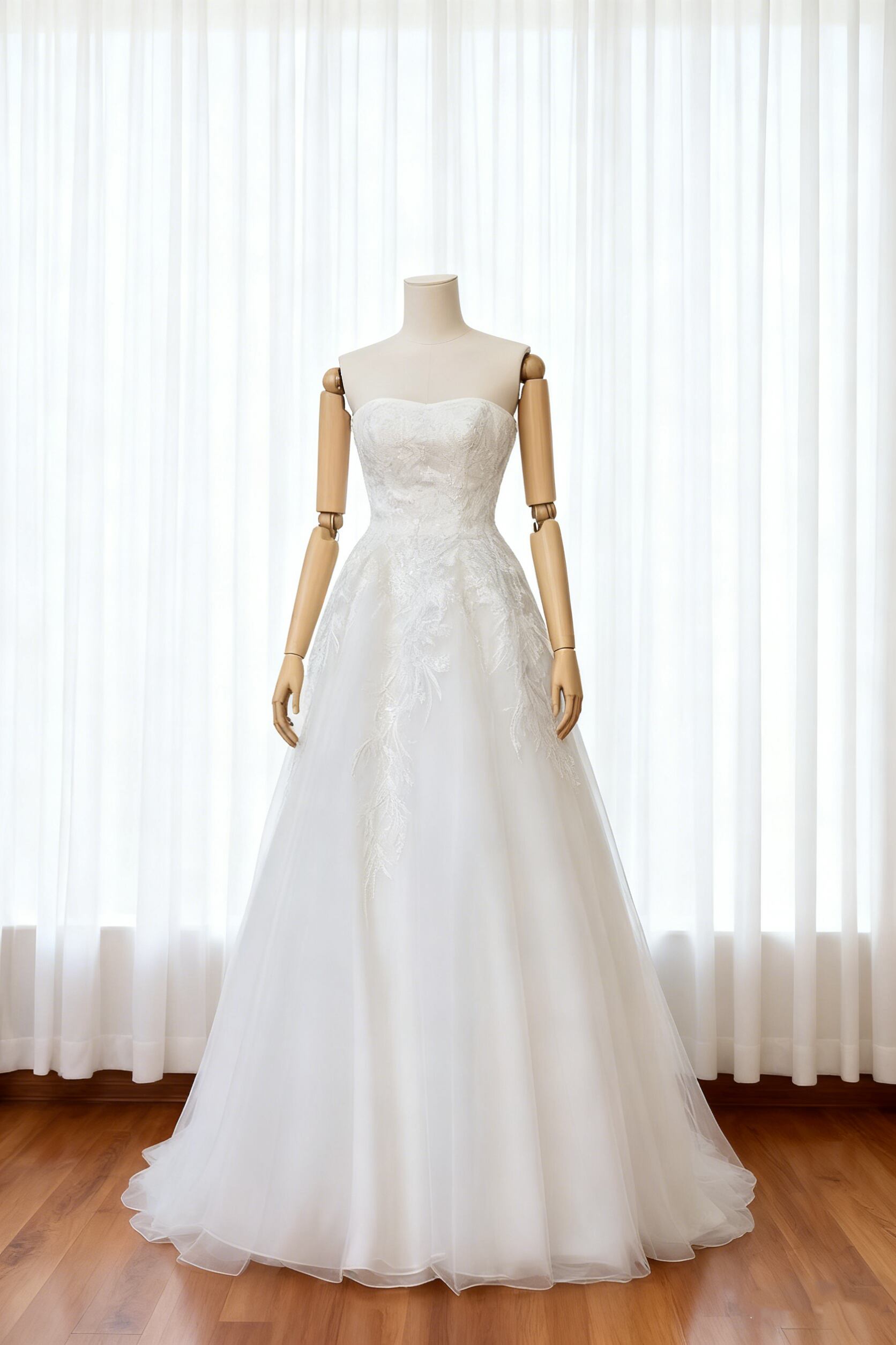 ウェディングドレス 柔らかく重ねたチュールスカート ベアトップ リーフ刺繍 インポートビジューレース