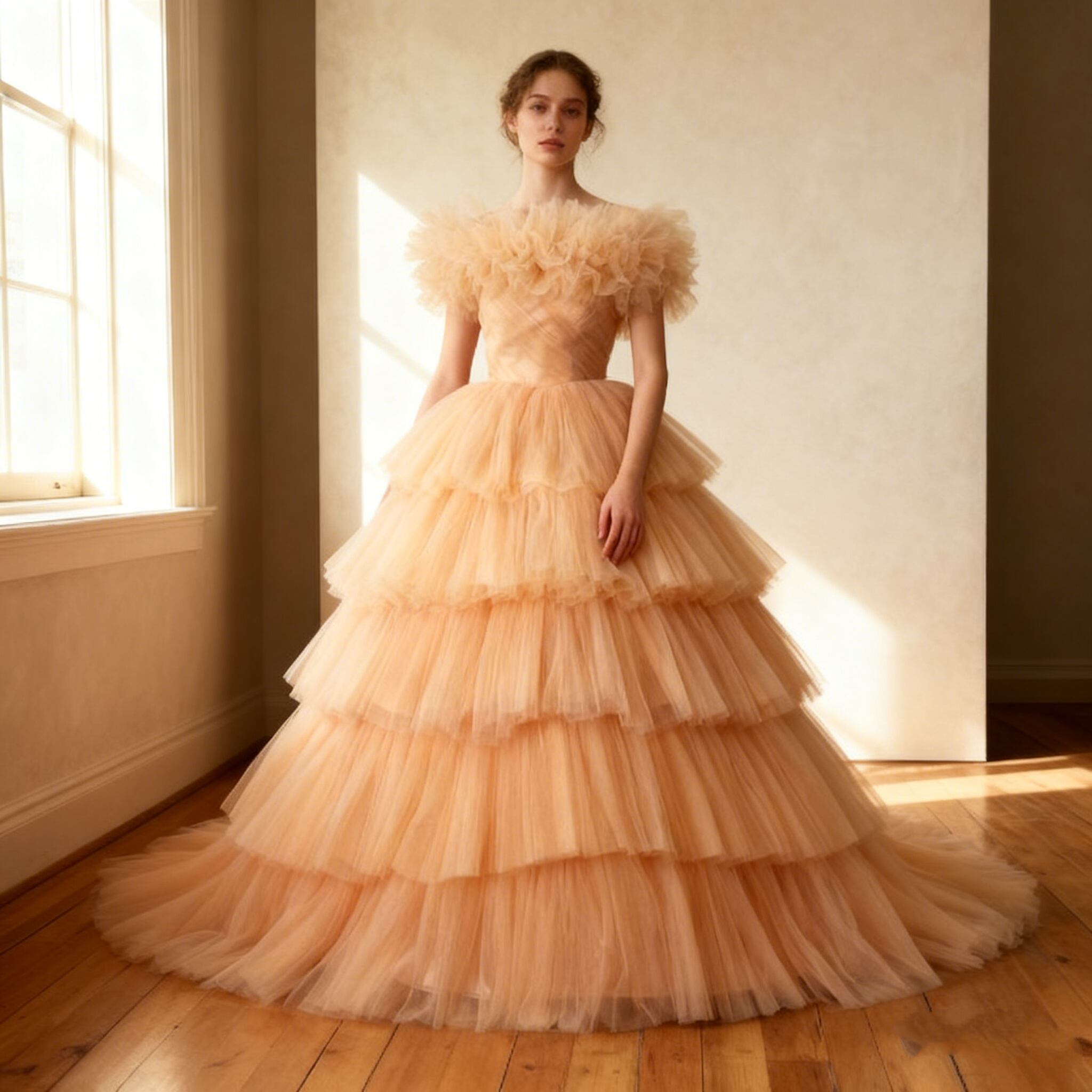 カラードレス オレンジ 取り外し可能なオフショルダー ティアードのドレス プリーツドレス