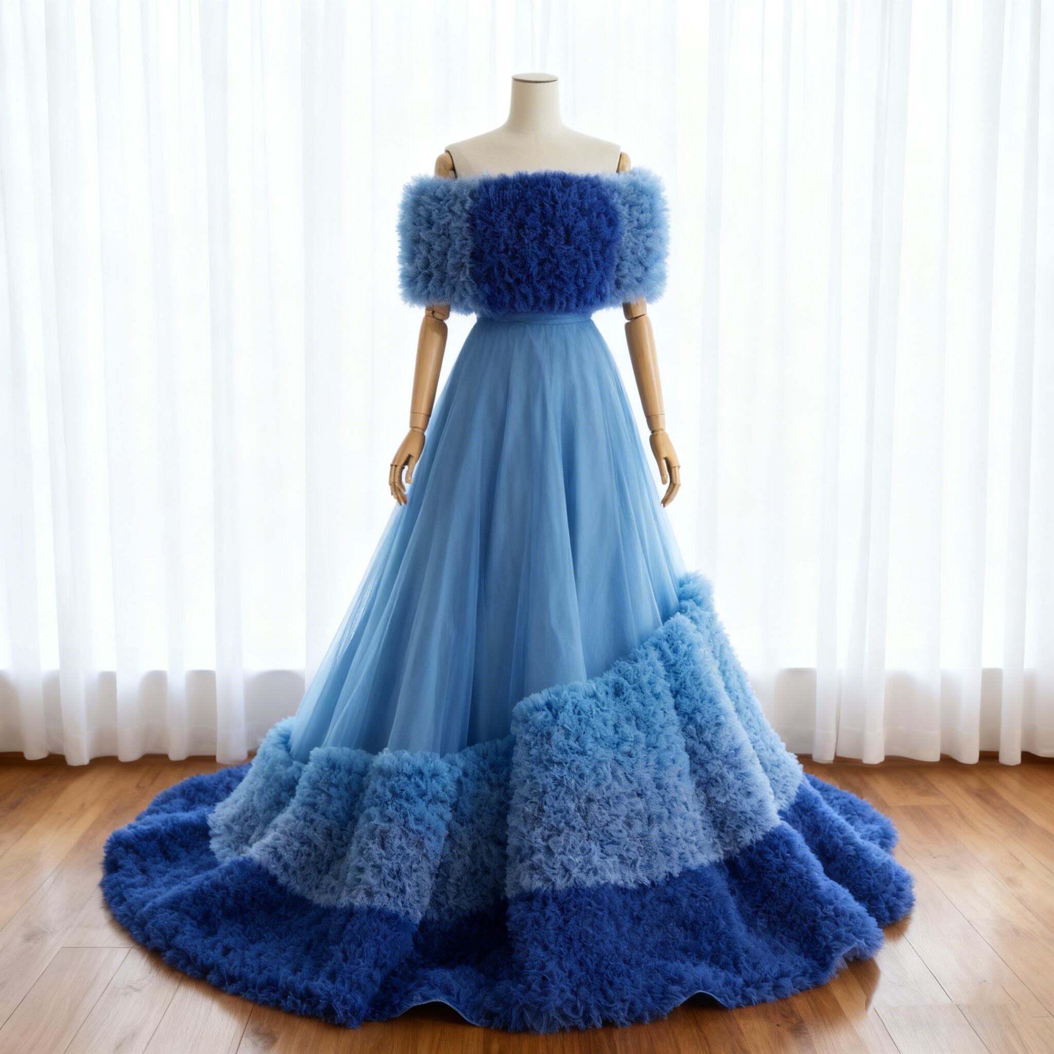 カラードレス オフショルダー 爽やかで優しいブルー もこもこドレス 抜群におしゃれ度が際立つ 披露宴 リボントレーン
