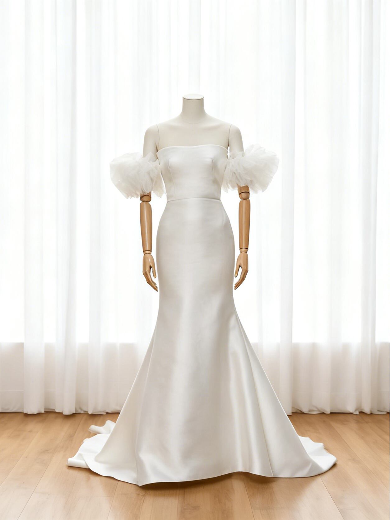 ウェディングドレス フリル袖 マーメイドライン オフホワイト ミカドサテン 優雅なシルエット ブライダル