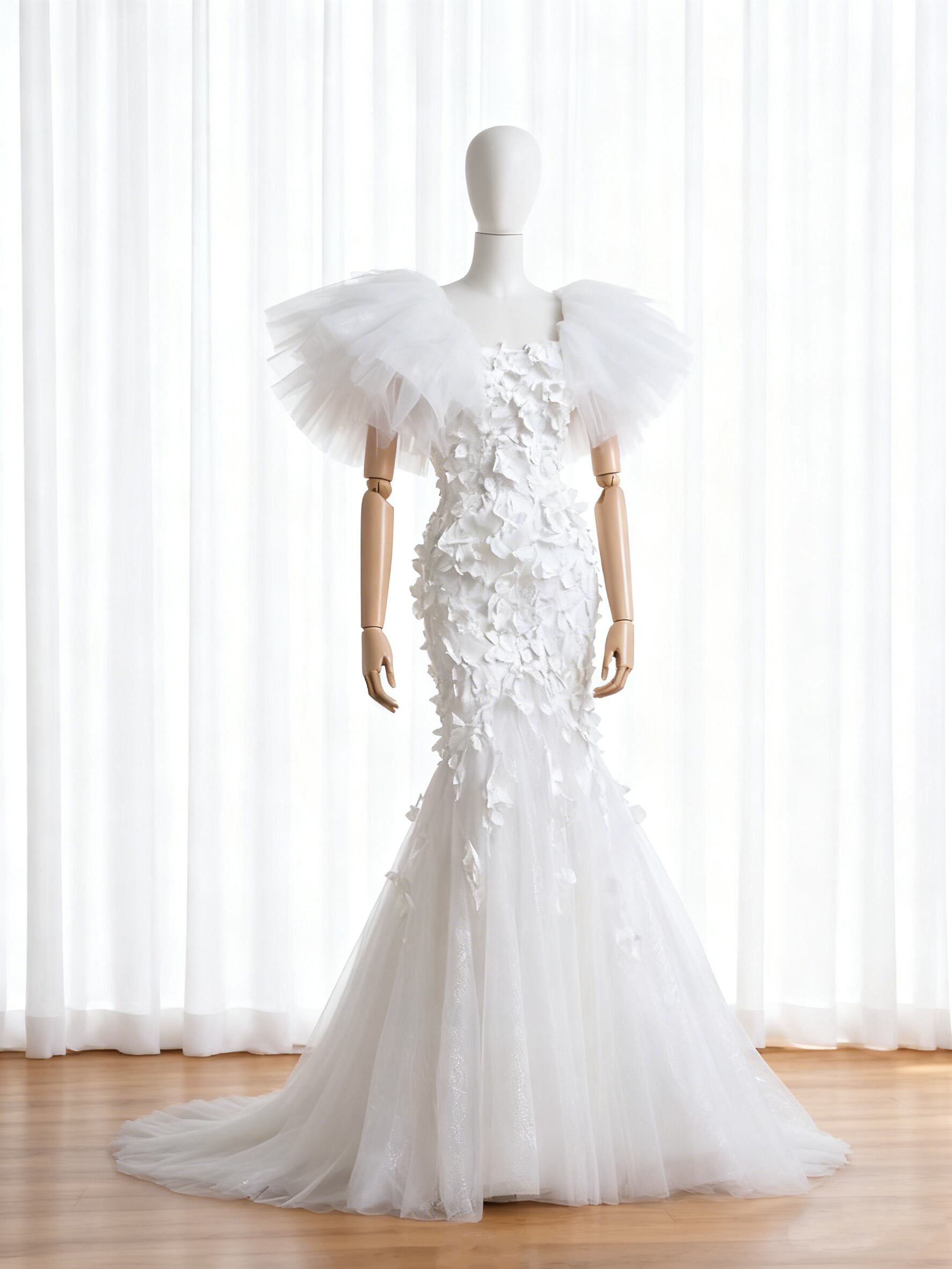 ウエディングドレス フレンチスリーブ マーメイドライン 3D立体レース刺繍 チュールスカート 結婚式 抜群におしゃれ度が際立つ