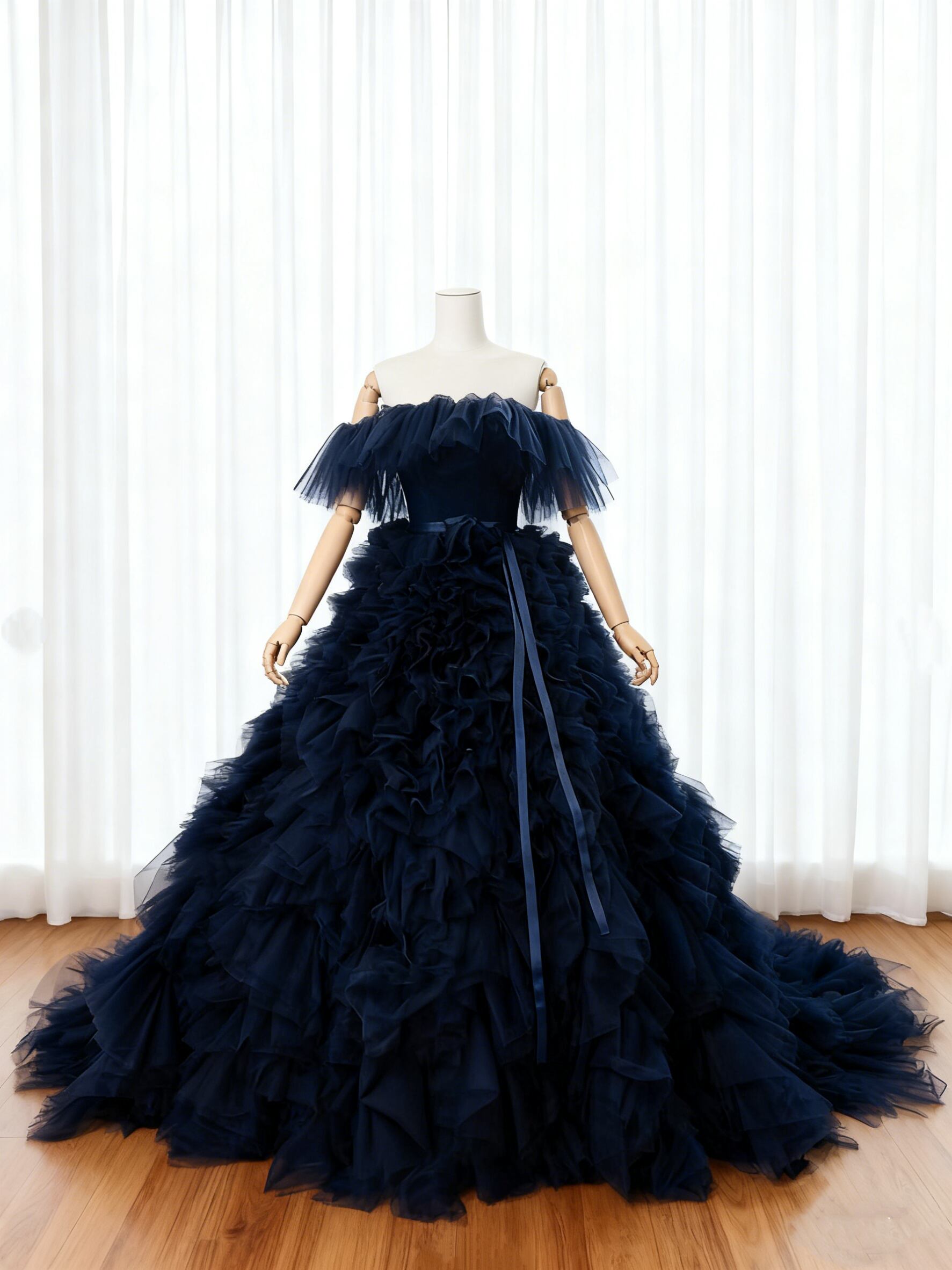 カラードレス オフショルダー ネイビー サッシュベルト もこもこドレス 結婚式 プリンセスライン