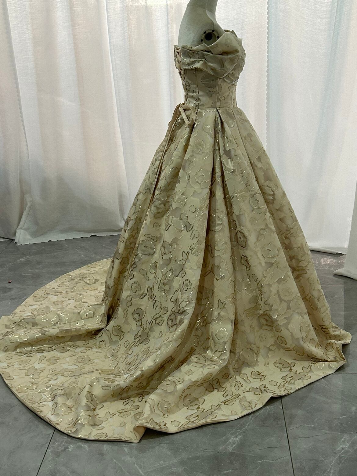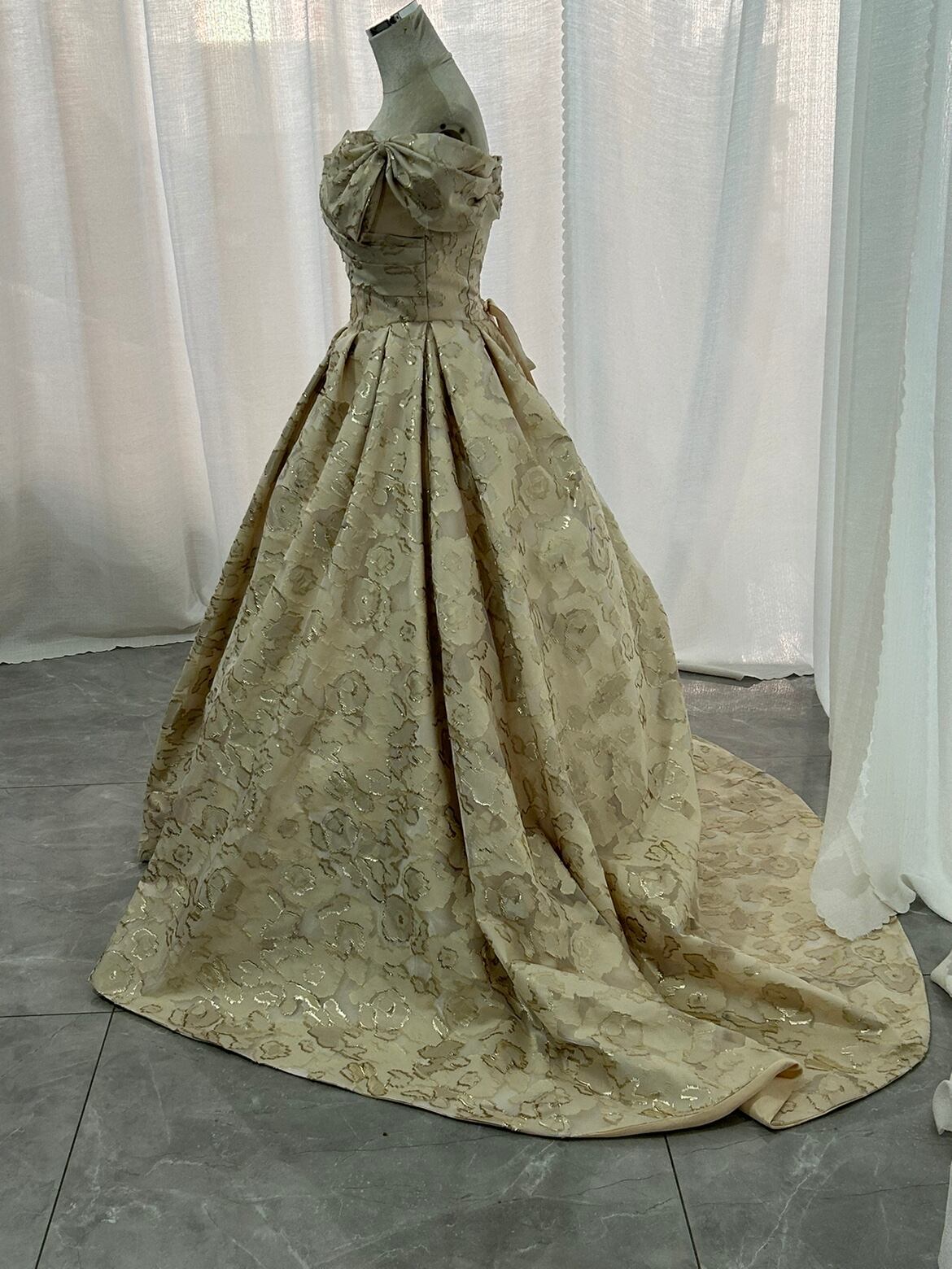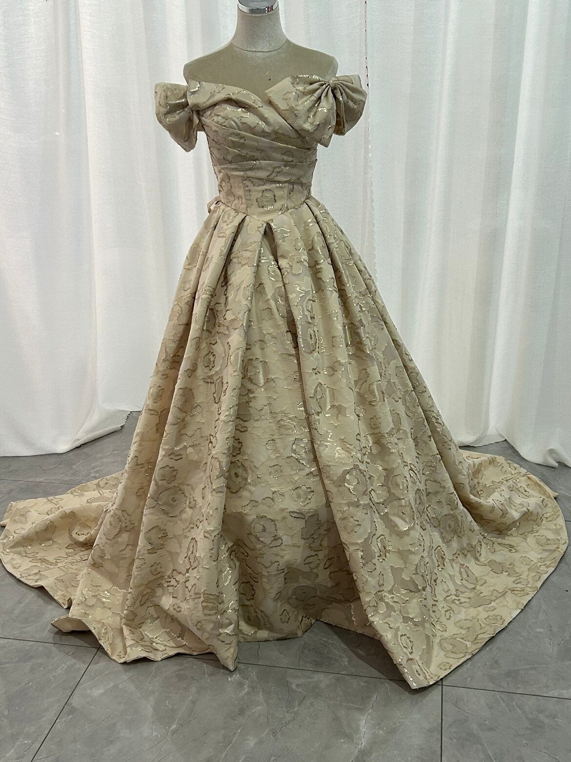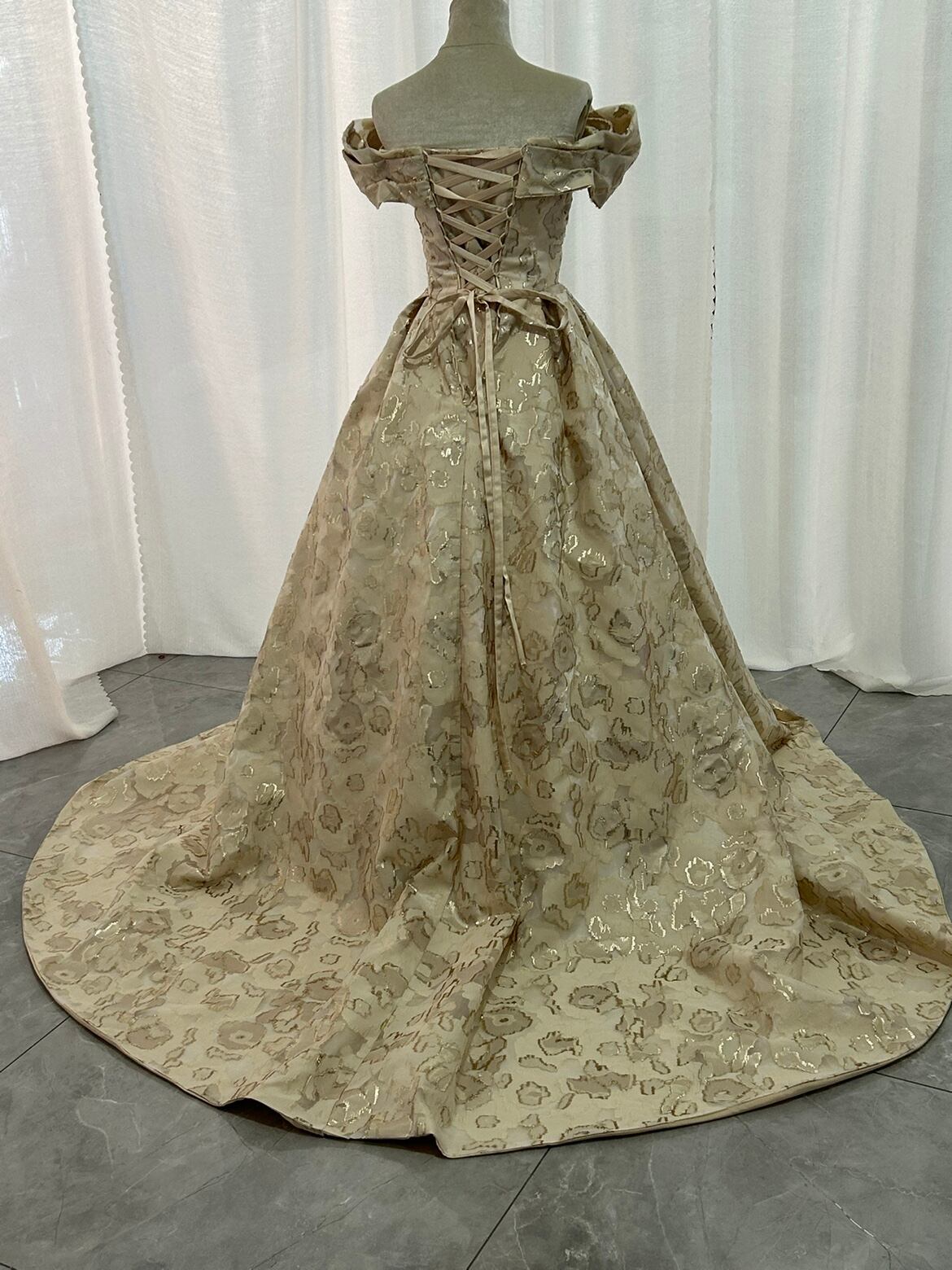 カラードレス ジャガード生地 オフショルダー 編み上げ 薄シャンパン色 結婚式 エレガント フランス風