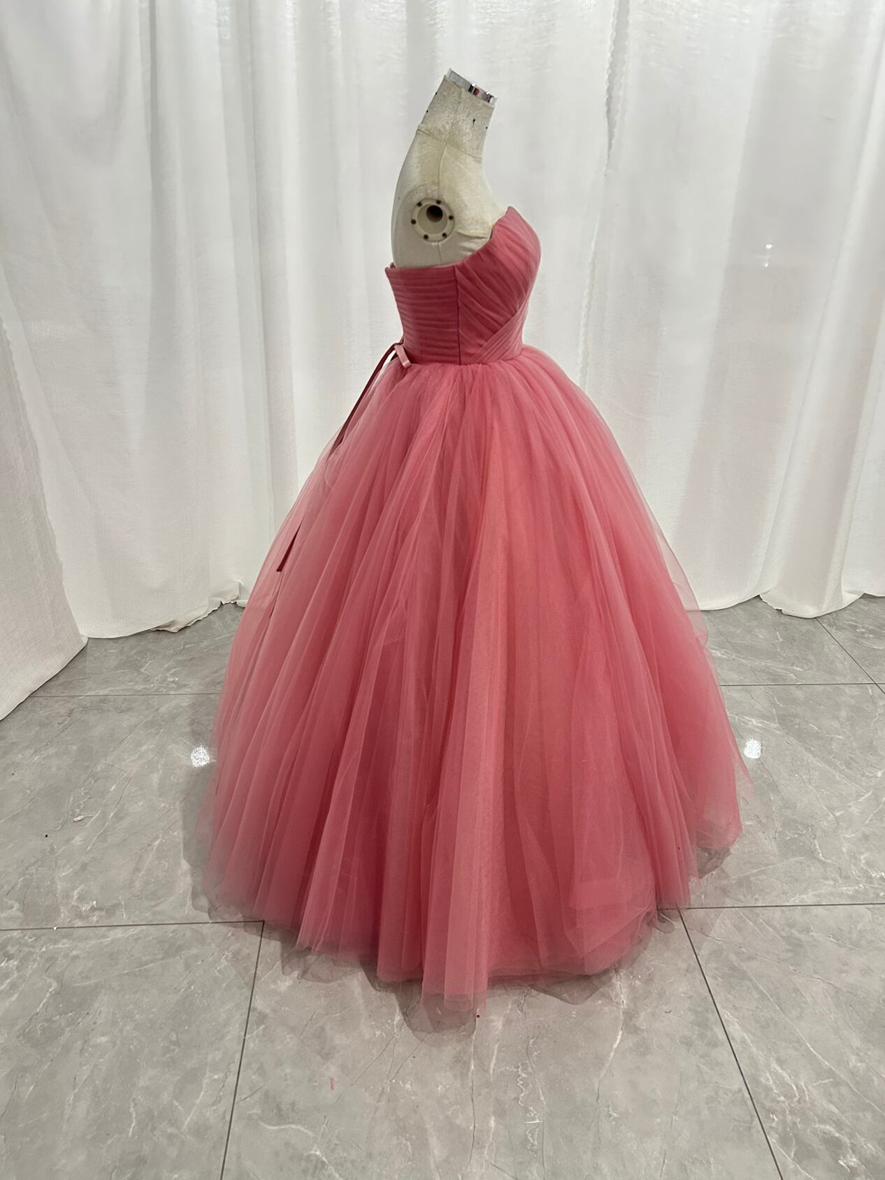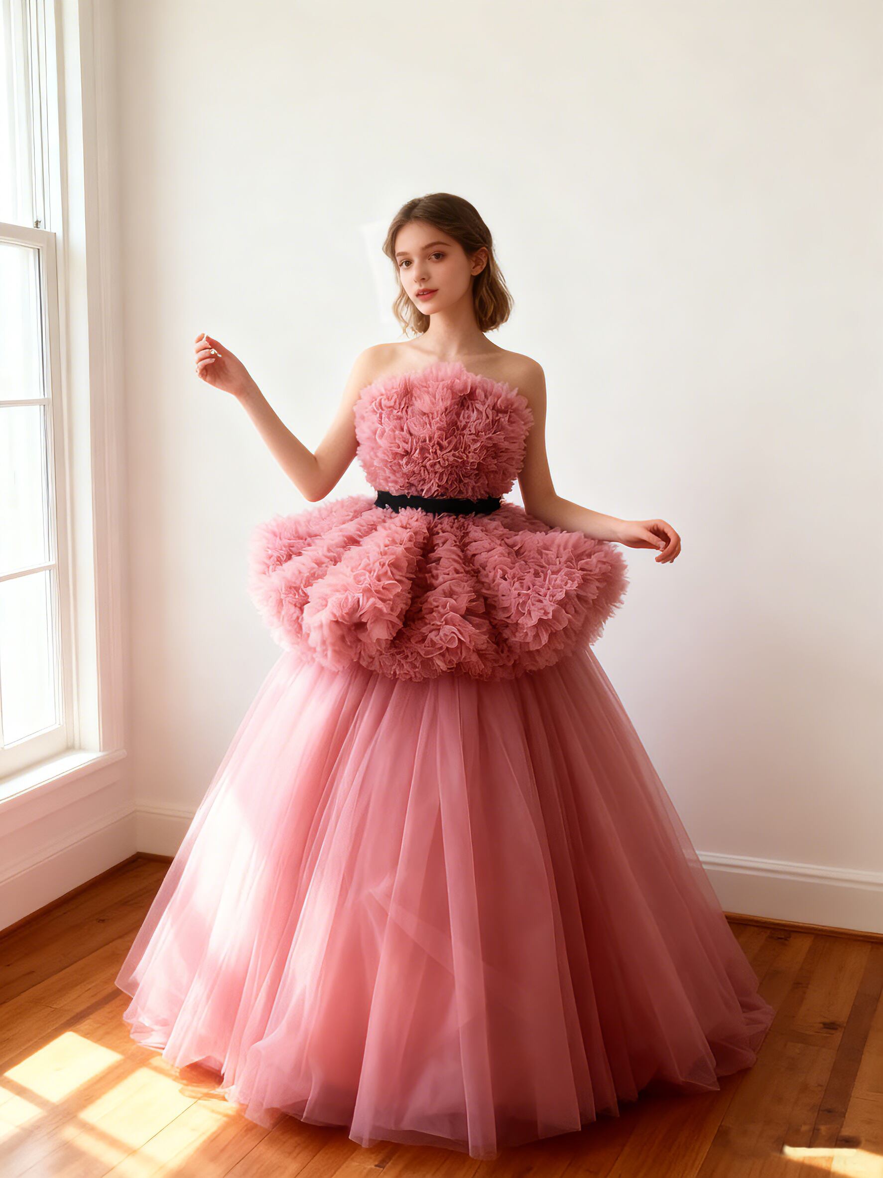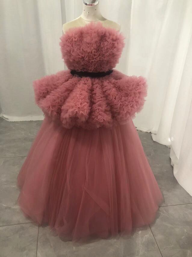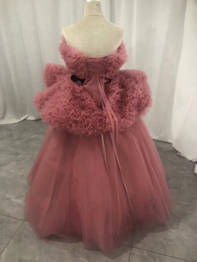 カラードレス ピンク ベアトップ 床付く 編み上げ ラッフルフリル フレアスカート ハンドドレープ 花嫁