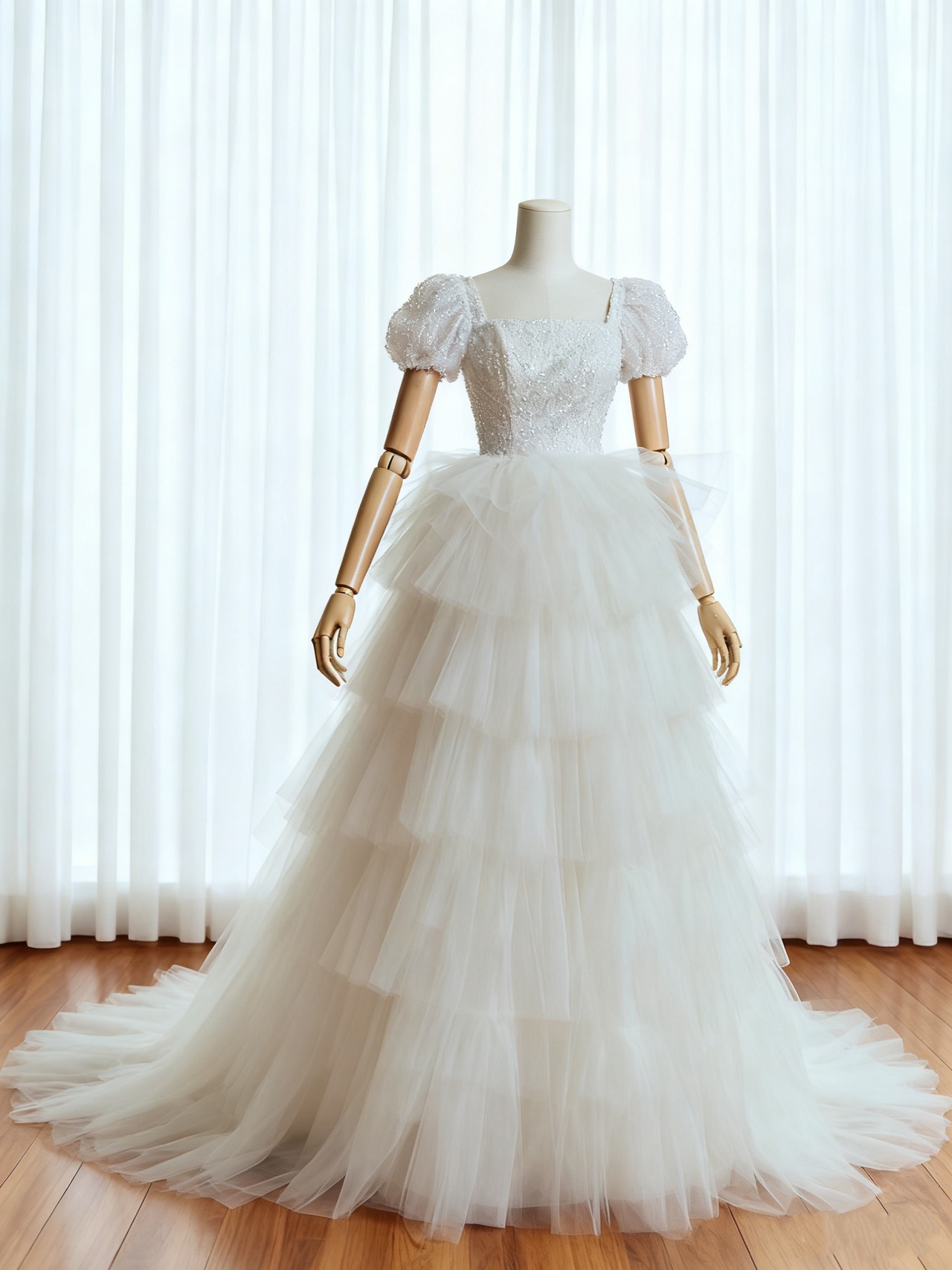 ウエディングドレス パフスリーブドレス スクエアネック ティアードのドレス 3D立体レース刺繍 チュールスカート