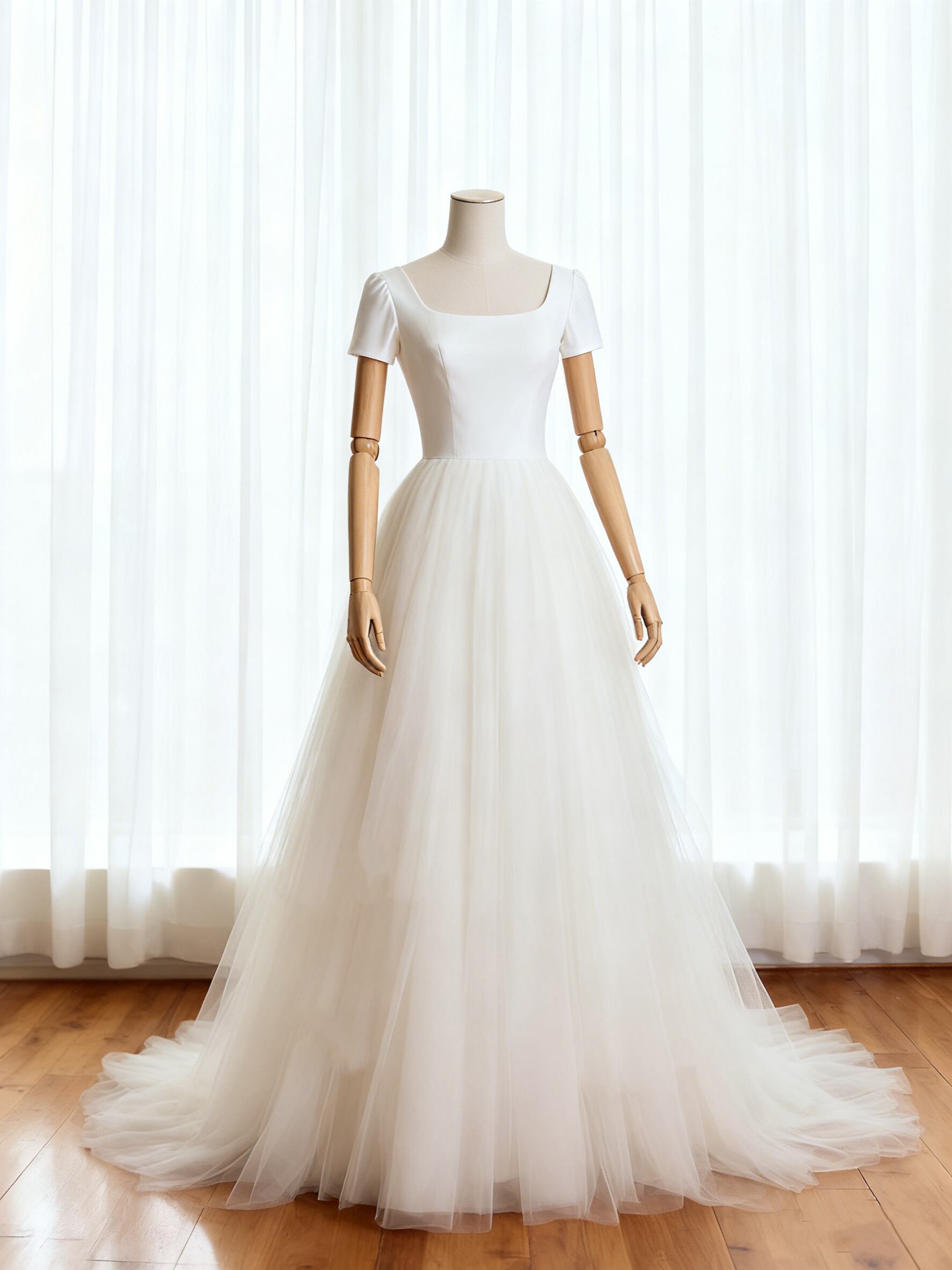 ウェディングドレス 半袖 チュールドレス スレンダーライン ラウンドネック 前撮り二次会