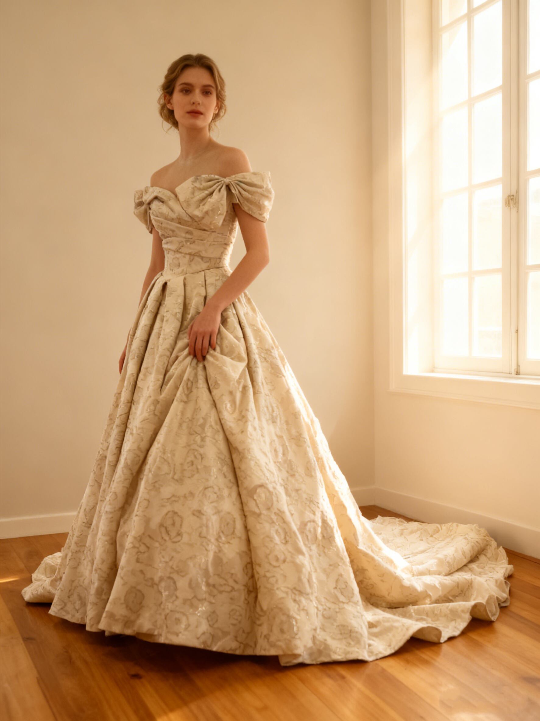 カラードレス ジャガード生地 オフショルダー 編み上げ 薄シャンパン色 結婚式 エレガント フランス風