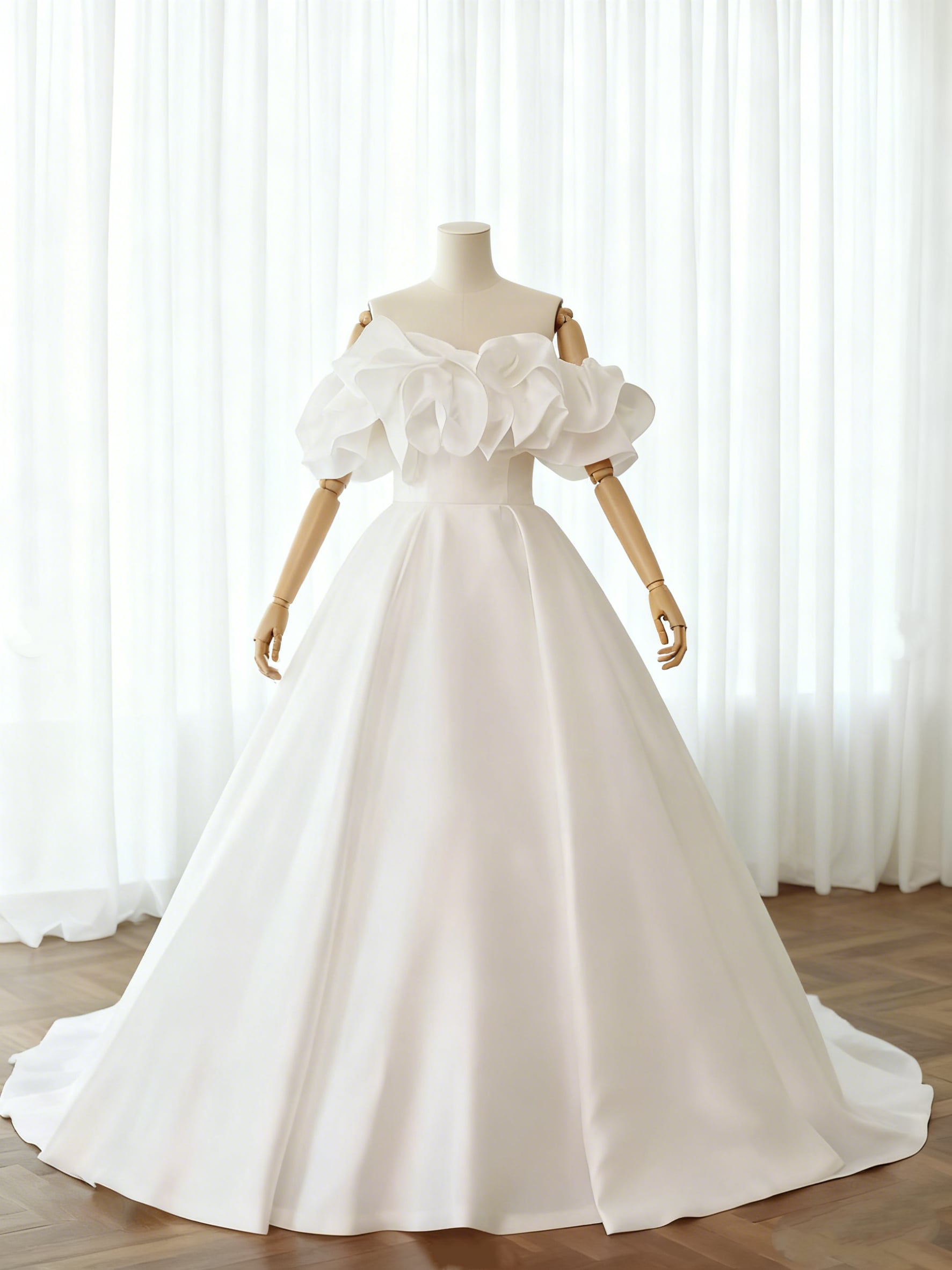 ウエディングドレス オフショルダー ラッフルフリル Aライン オフホワイト オーダーメイド可能 披露宴