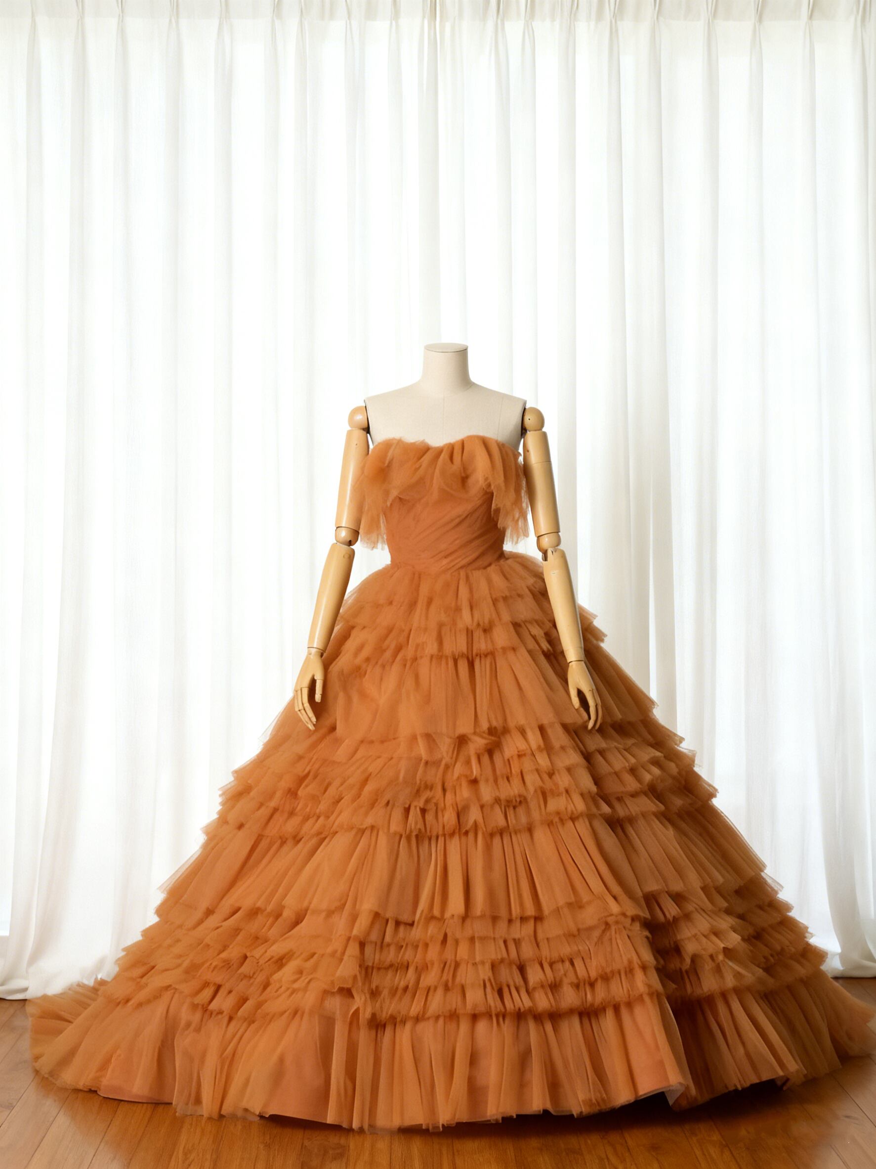カラードレス オレンジ ベアトップ 前撮り ふわふわドレス プリンセスライン オーダーメイド 抜群におしゃれ度が際立つ