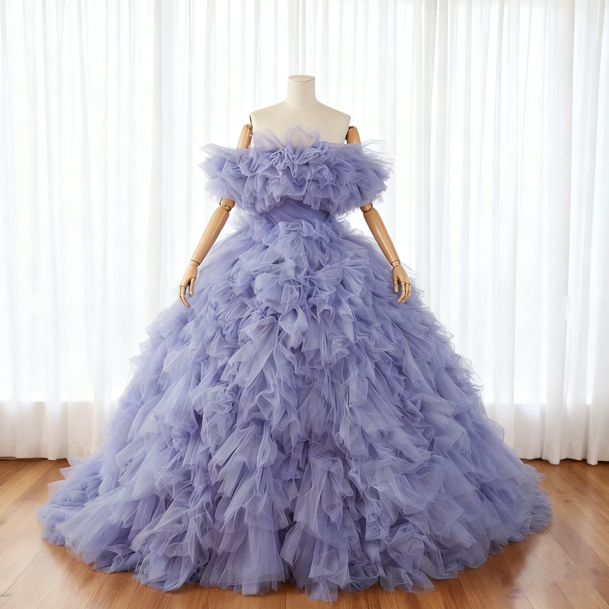 カラードレス パープル オフショルダー もこもこドレス プリンセスライン 抜群におしゃれ度が際立つ 花嫁