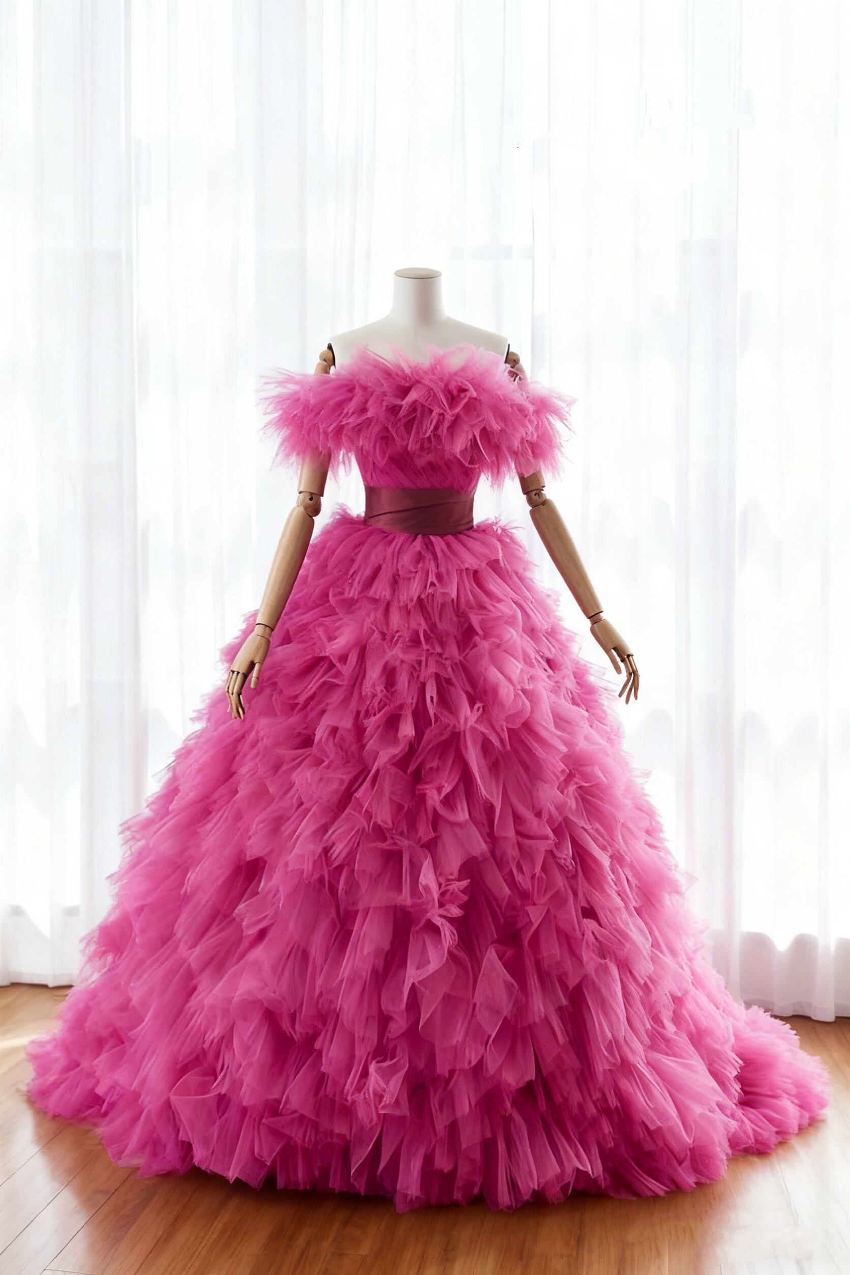 カラードレス ビビッドピンク オフショルダー プリンセスライン サッシュベルト もこもこドレス 花嫁