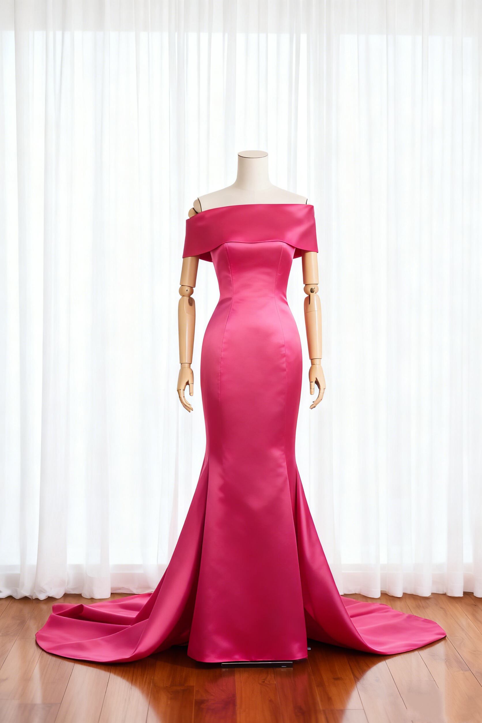 パーティードレス ビビッドピンク オフショルダー マーメイドライン 光沢サテン トレーン 優雅なシルエット