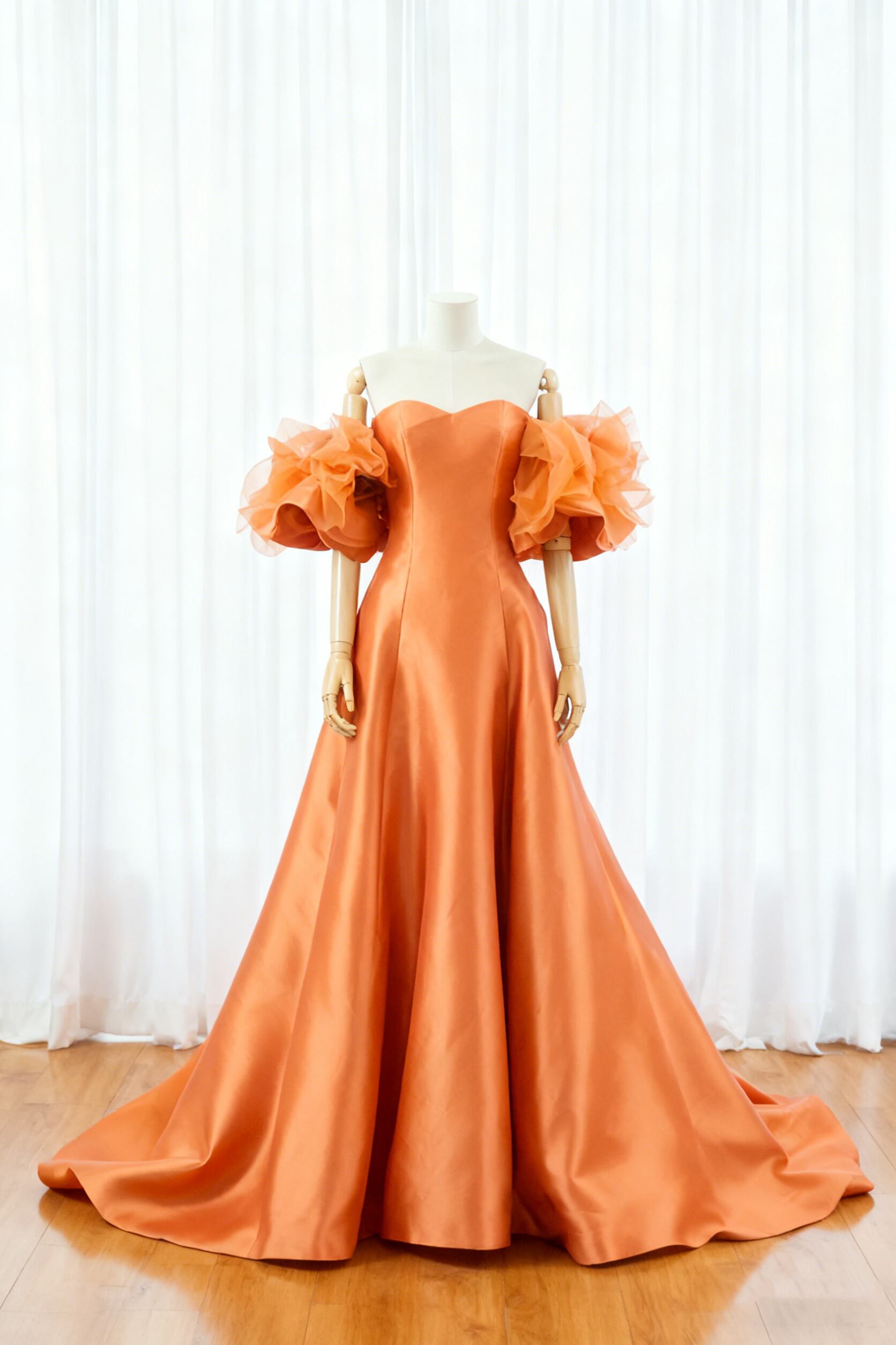 カラードレス オレンジ フリル袖 ソフトマーメイドライン ミカドサテン 姫袖 抜群におしゃれ度が際立つ