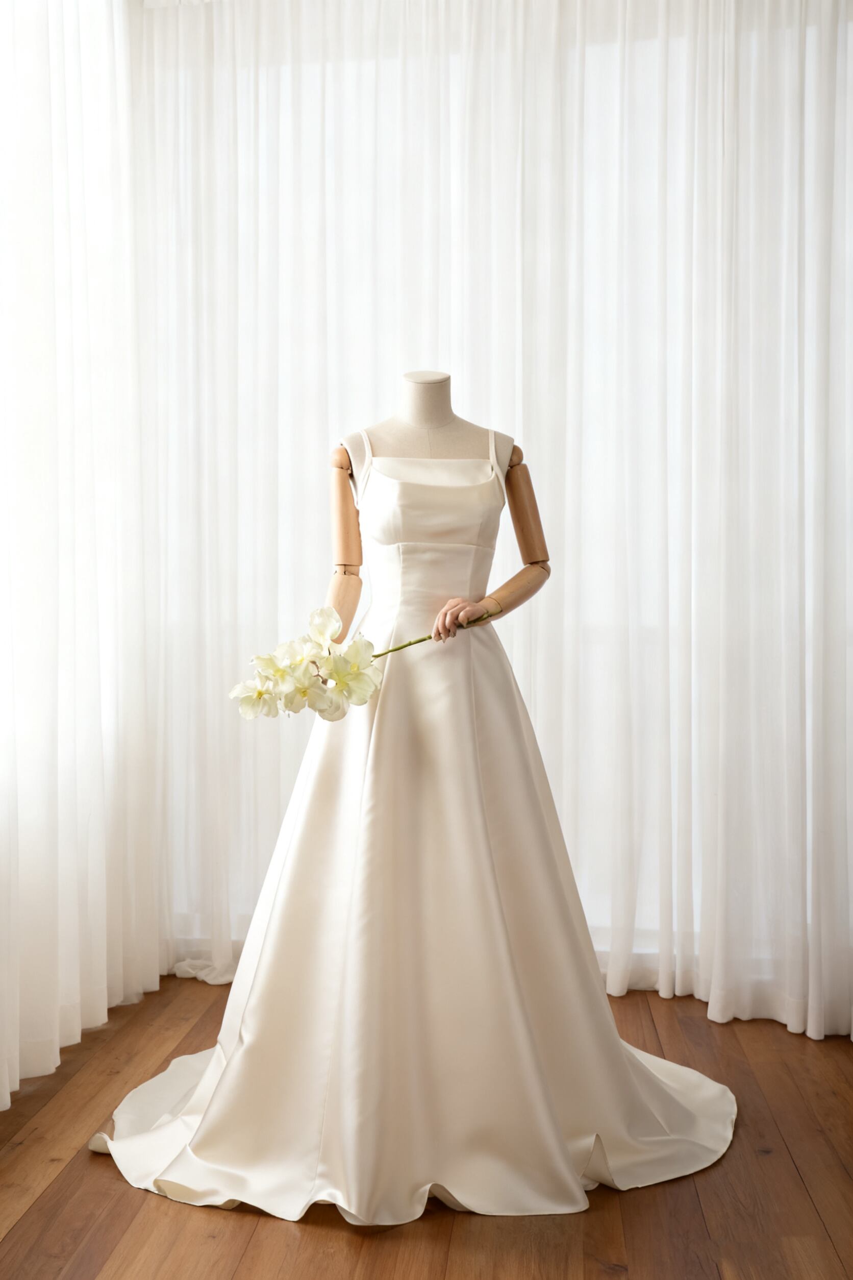 パーティードレス キャミソール 細見えシルエット 光沢サテン オフホワイト スレンダーライン 前撮り