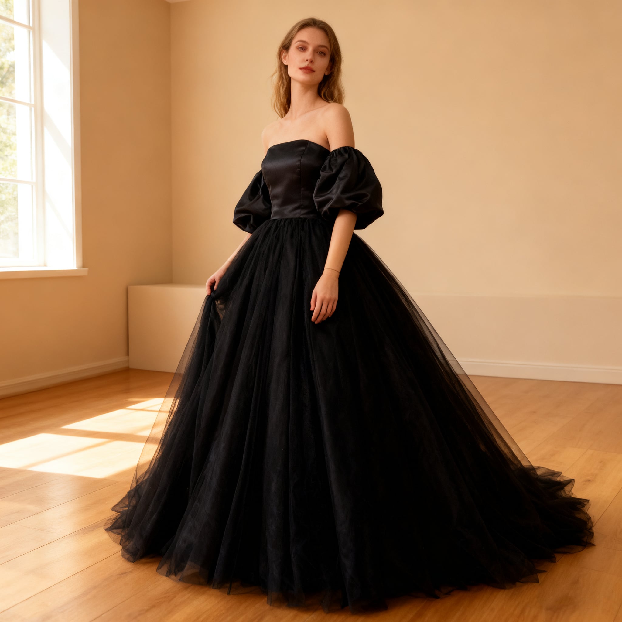 カラードレス パフスリーブ ブラック チュールスカート エレガント 前撮り