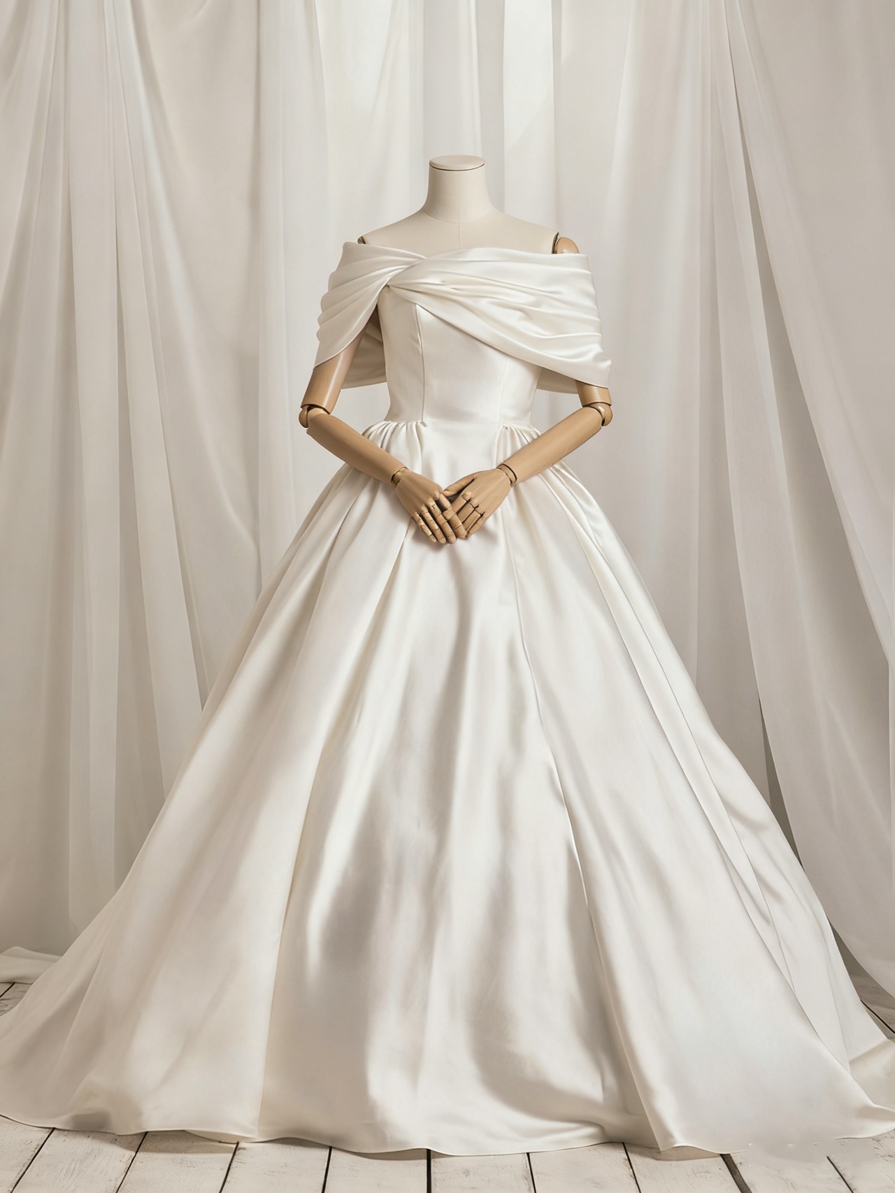 ウエディングドレス オフショルダー 光沢サテン ハンドドレープ 花嫁 オフホワイト ロングワンピース