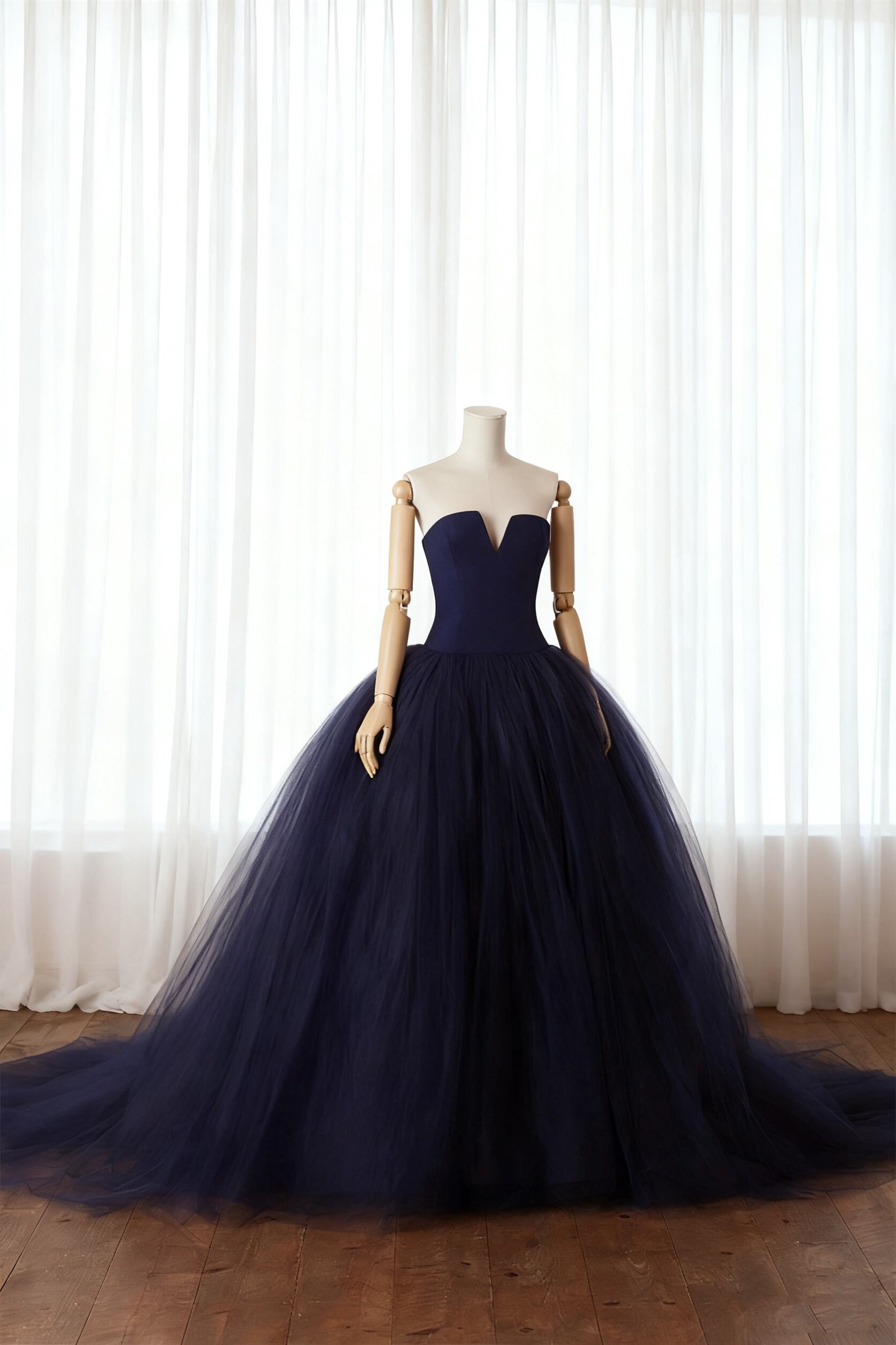 カラードレス ネイビー ベアトップ 柔らかく重ねたチュールスカート シアーな美しさ お呼ばれ/二次会