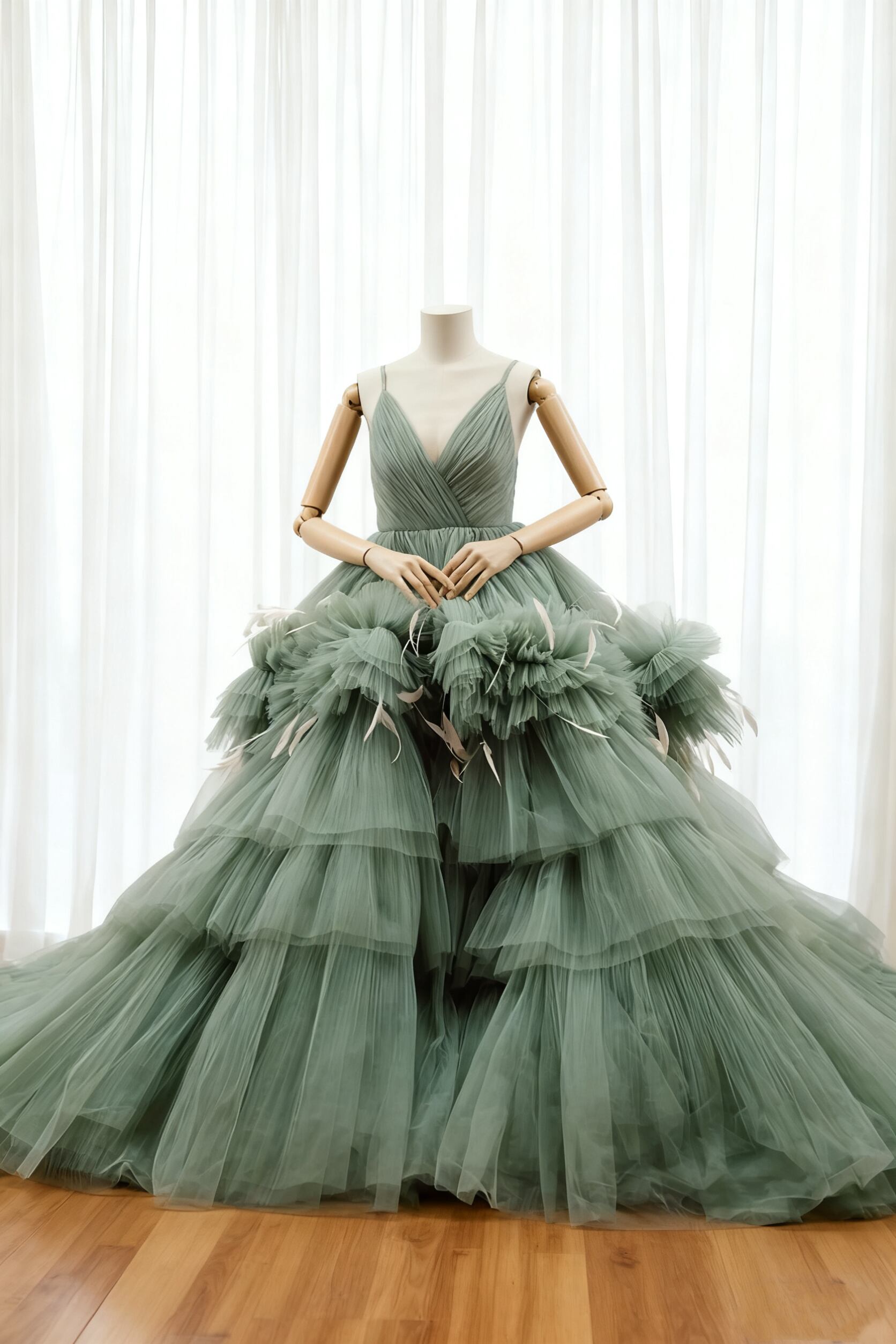 カラードレス グリーン キャミソール プリンセスライン Vネックドレス プリーツスカート 抜群におしゃれ度が際立つ