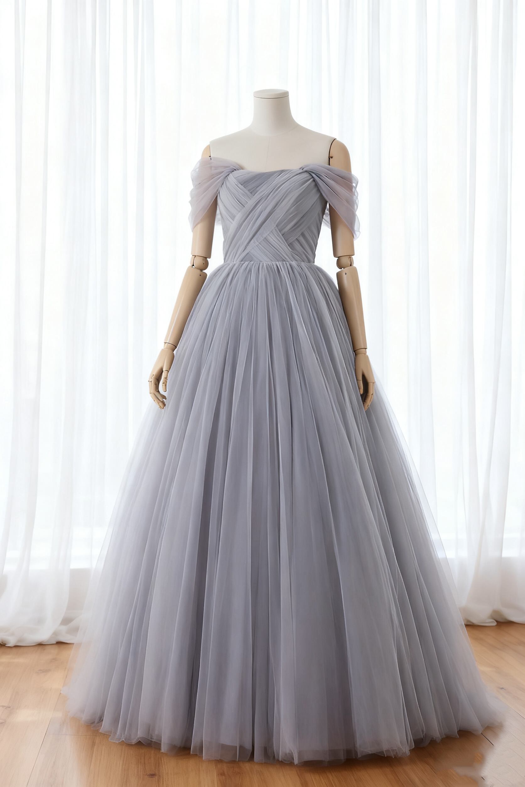 カラードレス オフショルダー ブルーグレー ソフトチュール 結婚式/披露宴