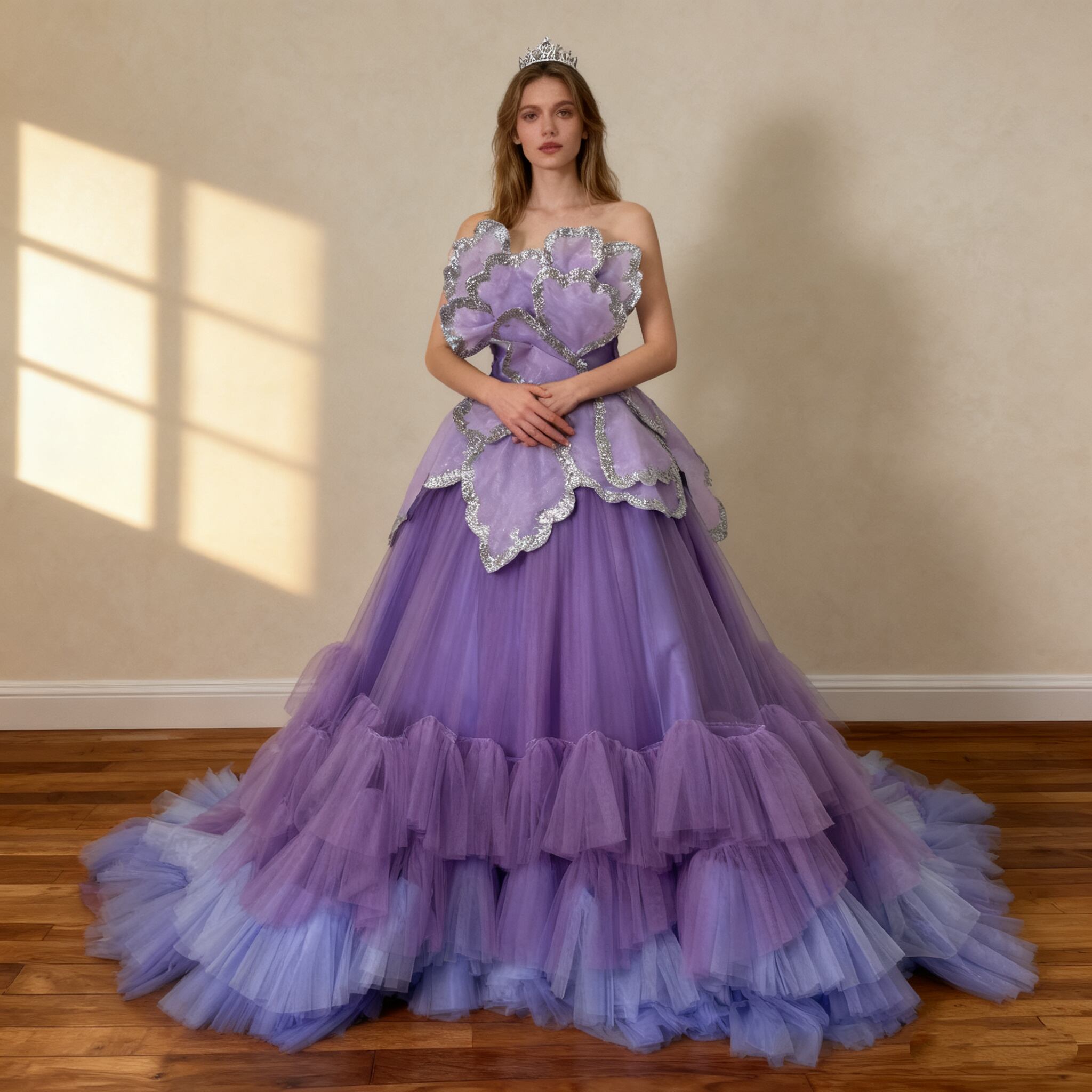 カラードレス パープル グラデーションドレス 編み上げ プリンセスライン バラトレーン ふわふわ 花嫁