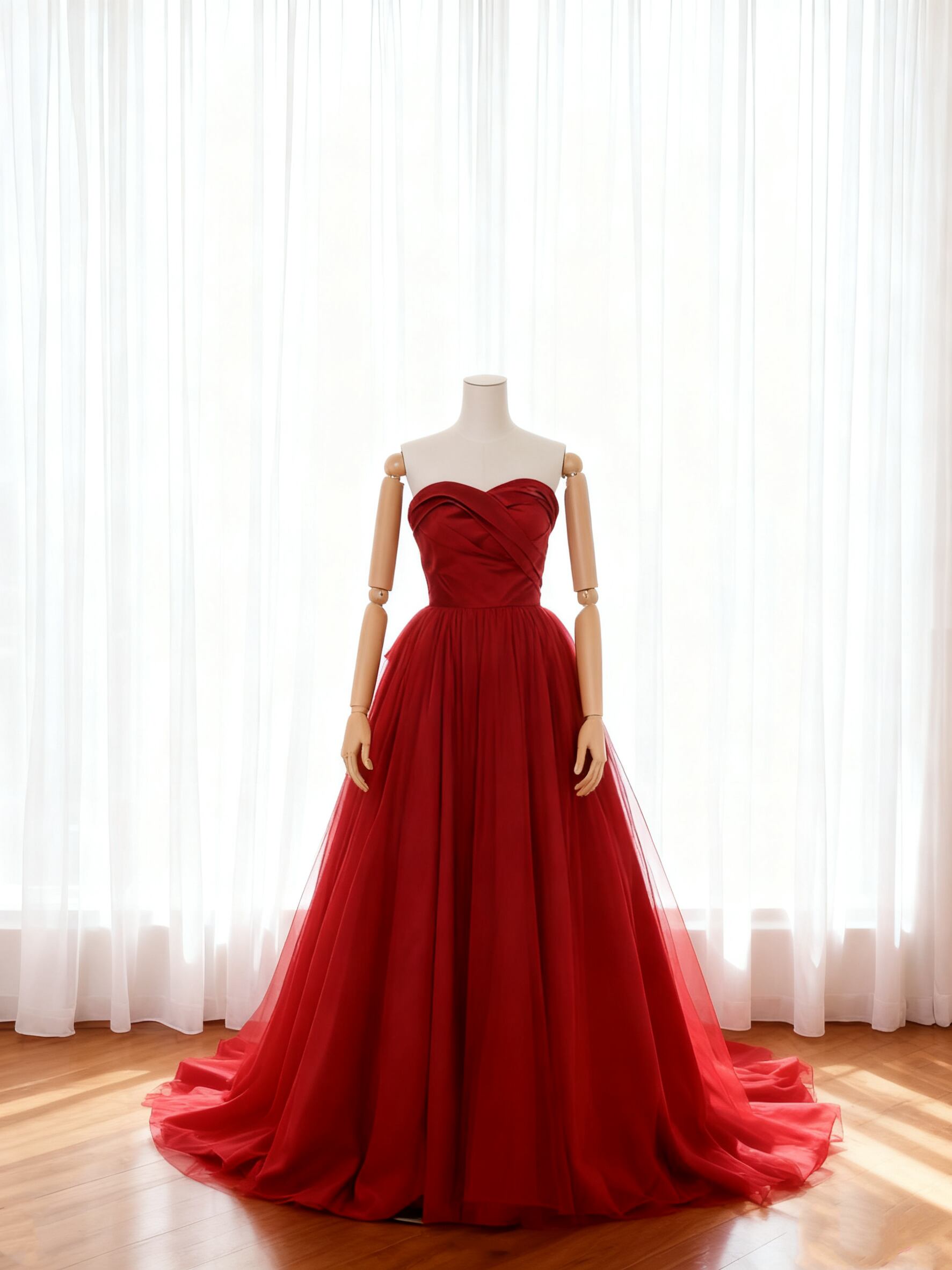 カラードレス ボルドー色 ハンドドレープ 柔らかく重ねたチュールスカート エレガント クラシカル 前撮り 二次会
