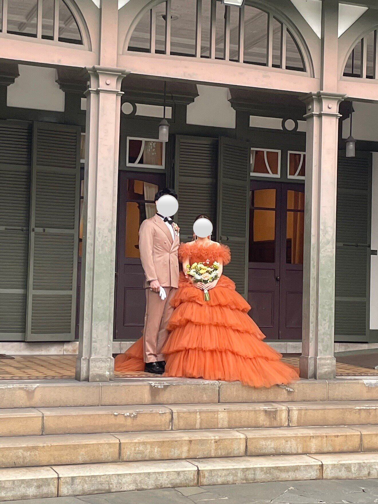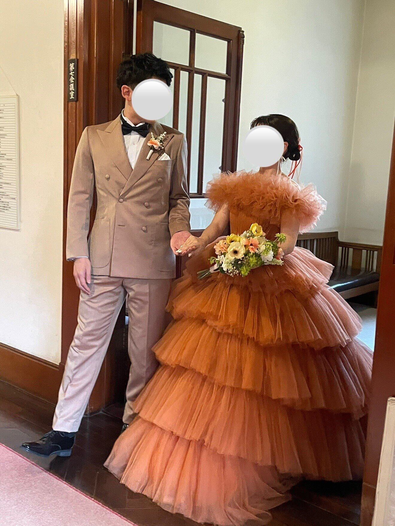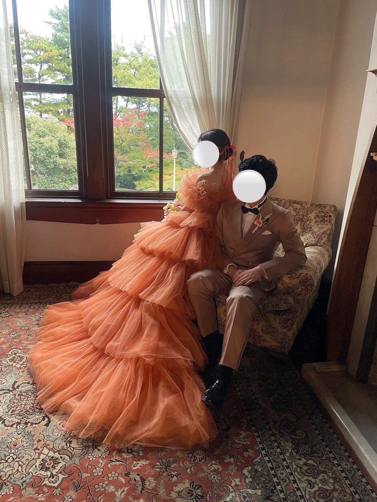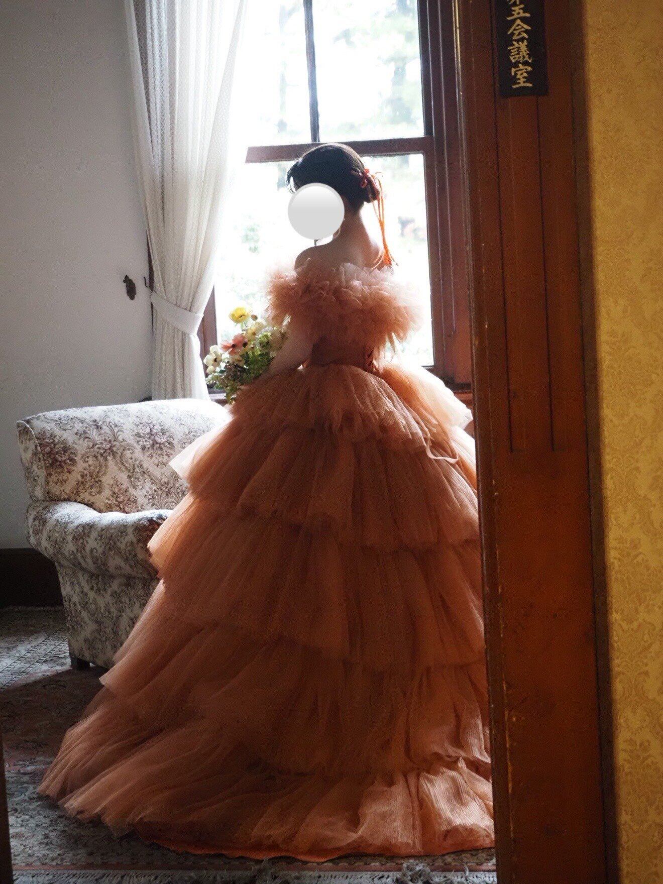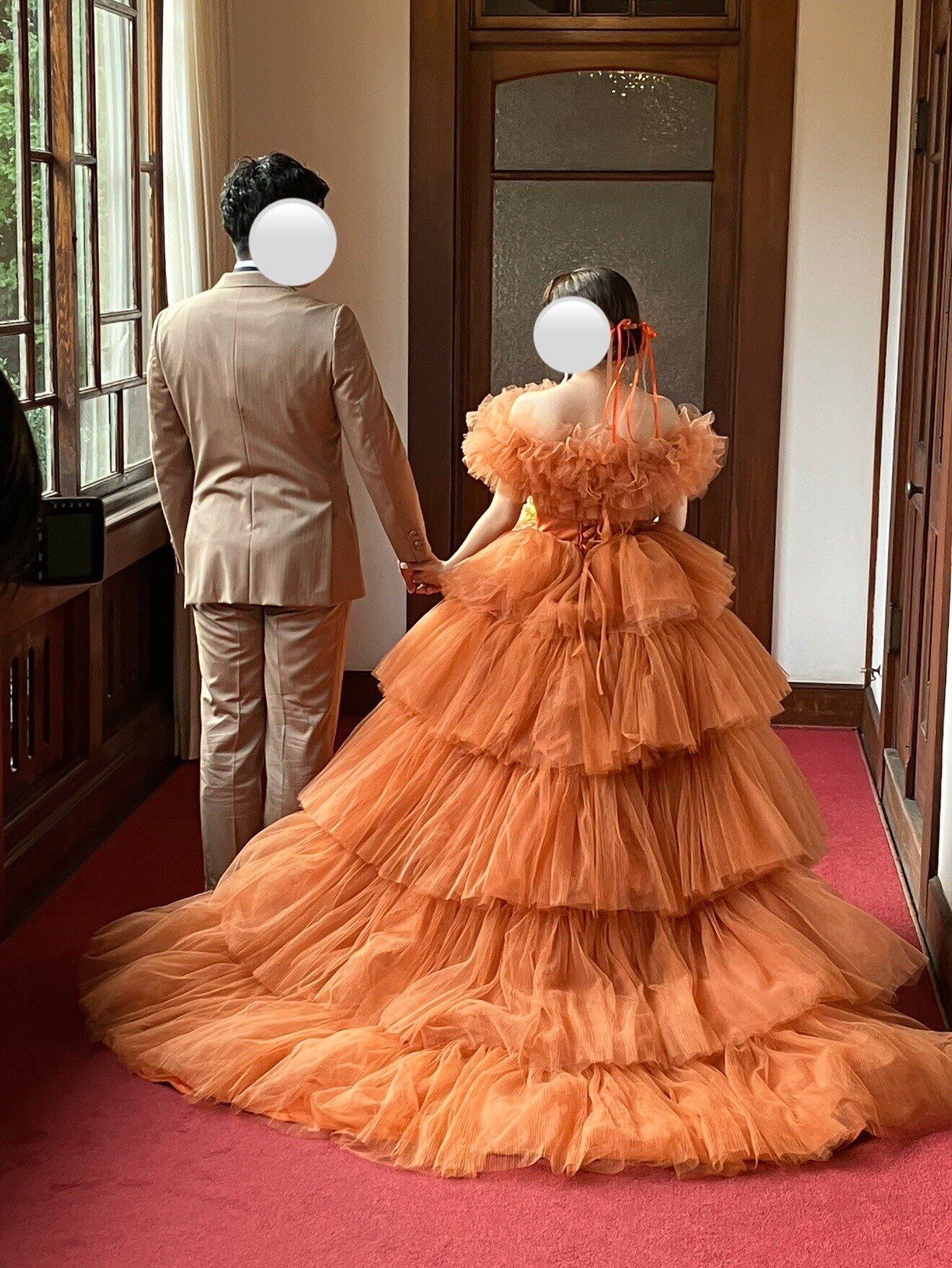実例写真!カラードレス テラコッタ 取り外し可能なオフショルダー ティアードのドレス プリーツドレス 花嫁