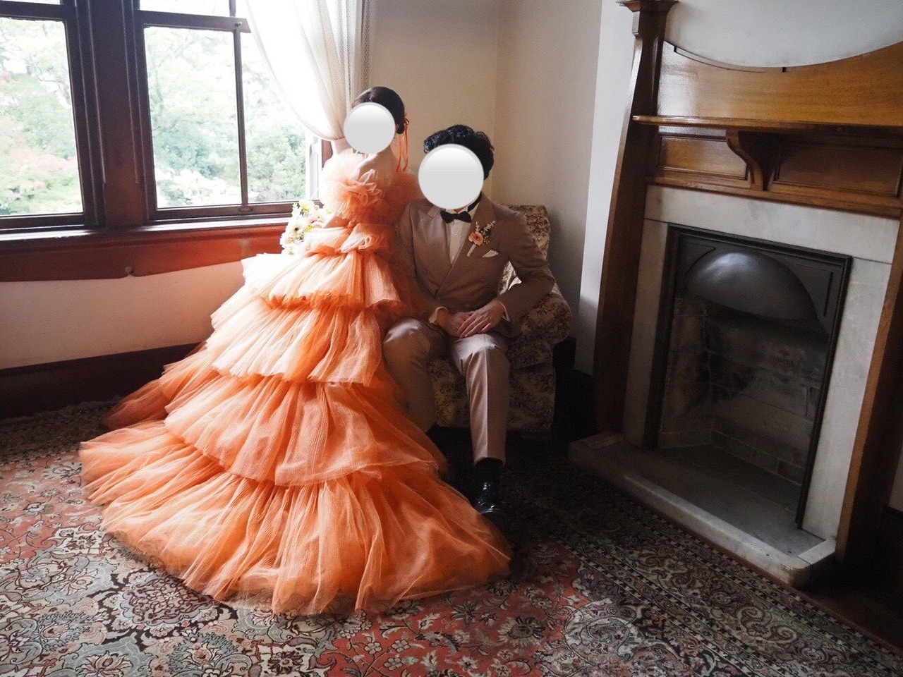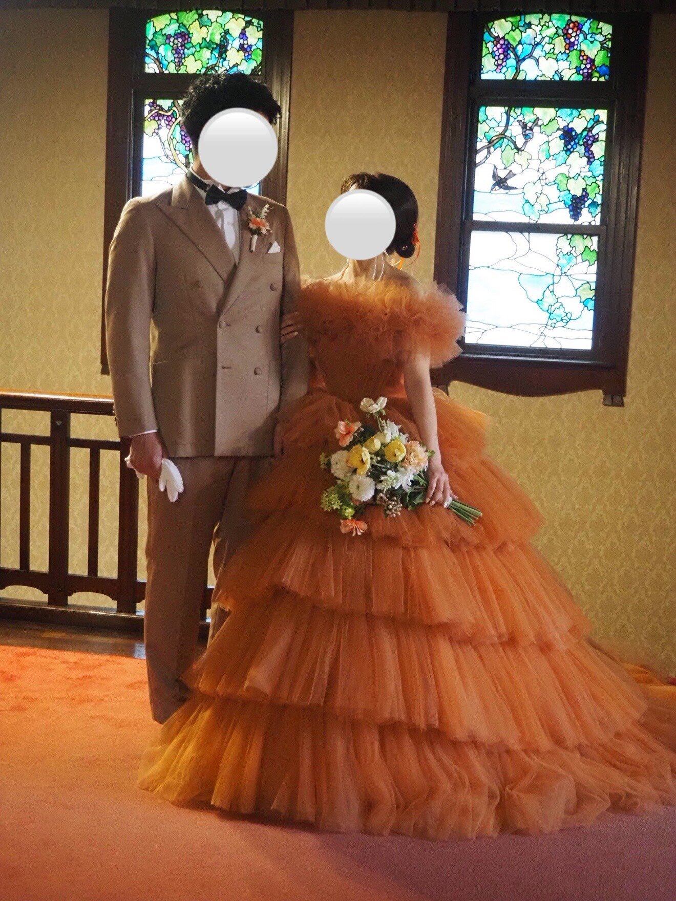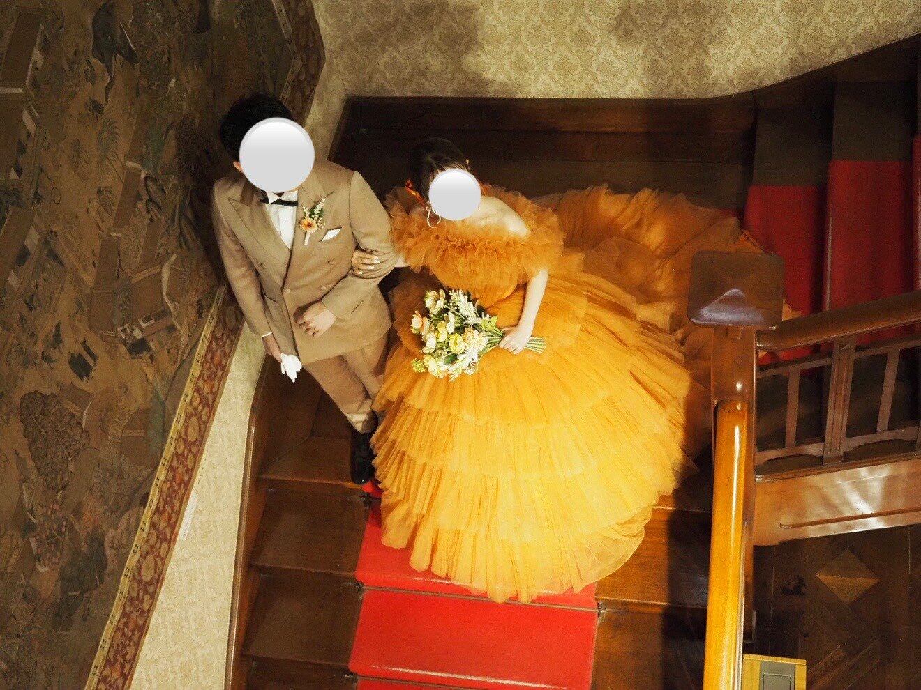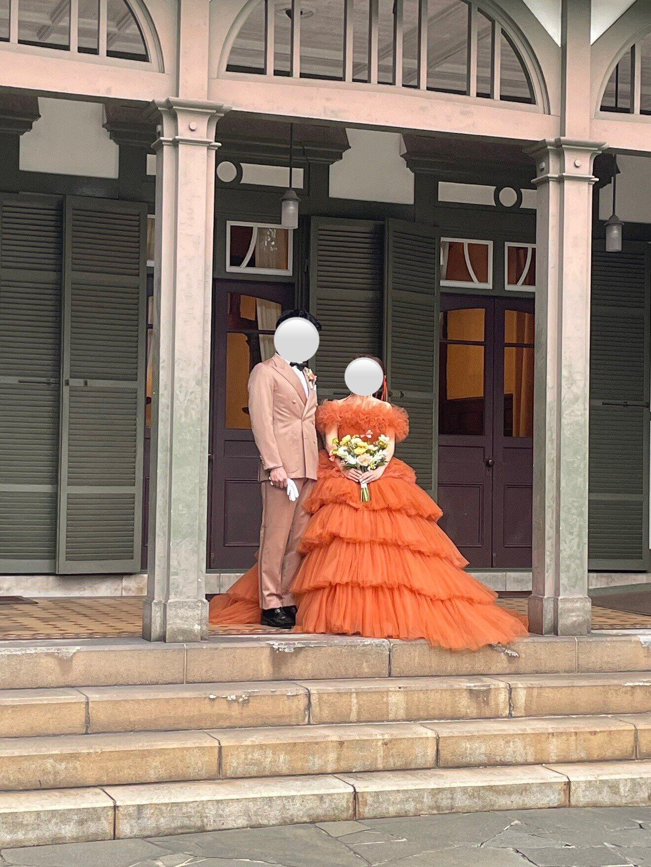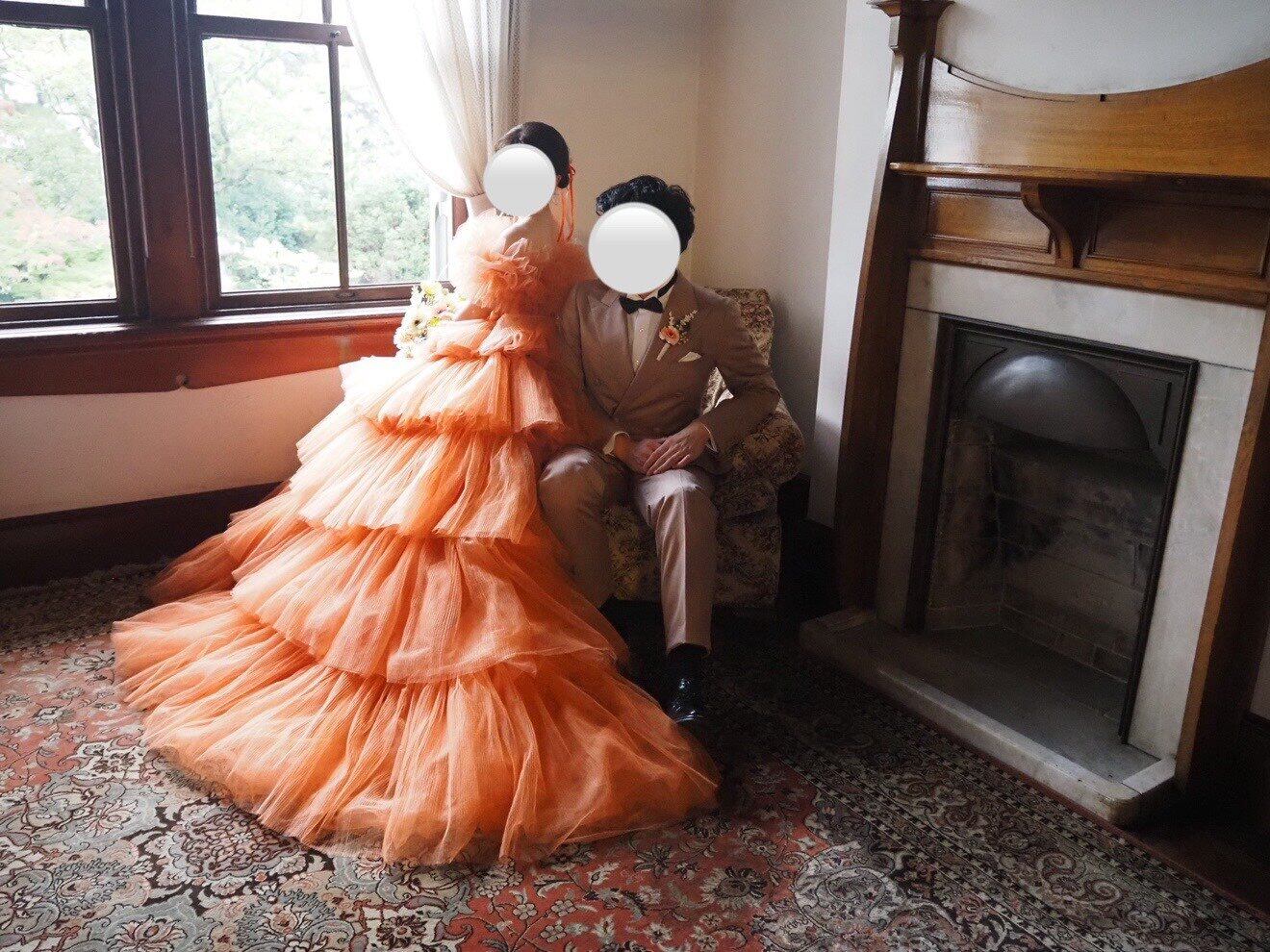 実例写真!カラードレス テラコッタ 取り外し可能なオフショルダー ティアードのドレス プリーツドレス 花嫁