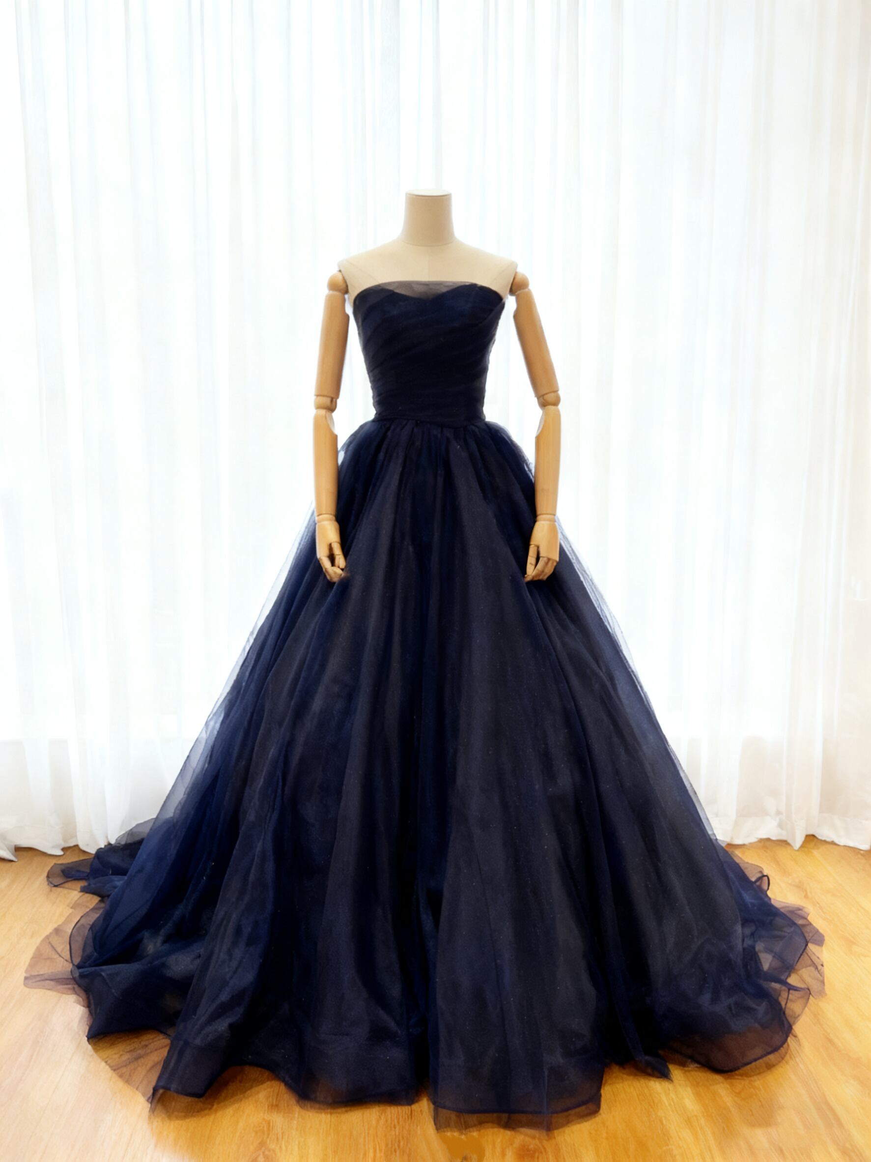 カラードレス ネイビー 上質オーガンジー ベアトップ エレガント アンティークなドレス 音楽会 前撮り