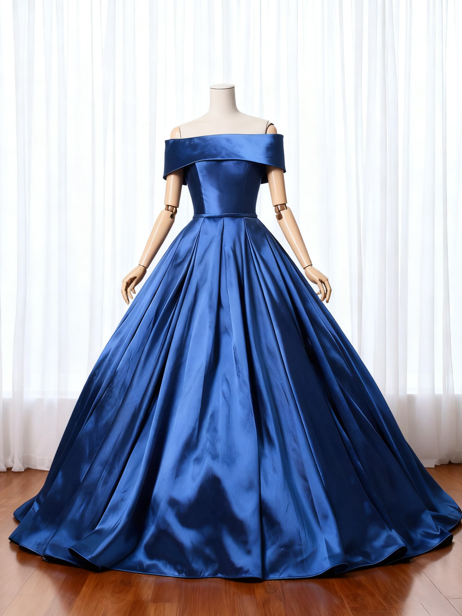 カラードレス ネイビー 光沢サテン オフショルダー 細見えシルエ