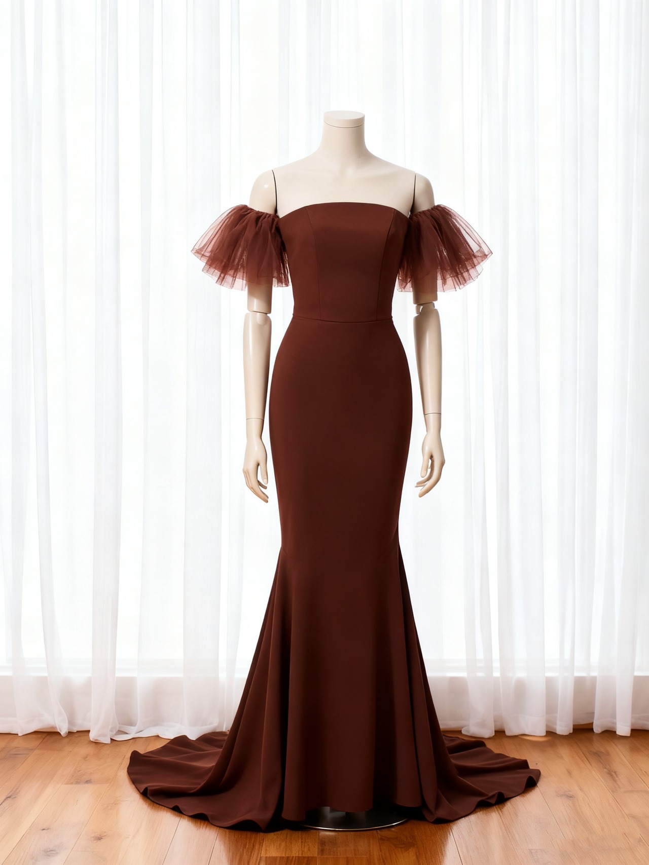 パーティードレス ブラウン マーメイドライン フリル袖 クレープ生地 スレンダーライン 前撮り