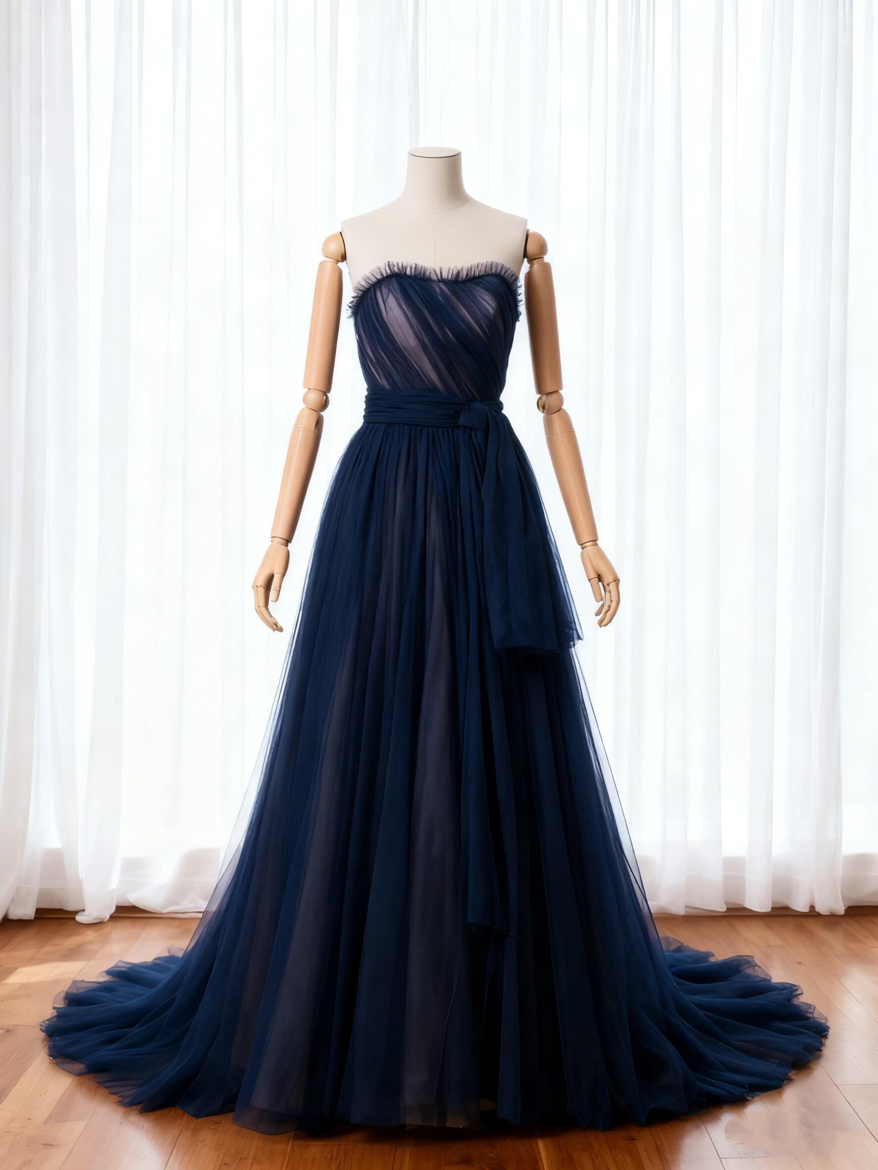 カラードレス ネイビー ベアトップ チュールスカート Aライン 前撮り ハンドドレープ