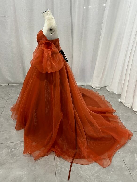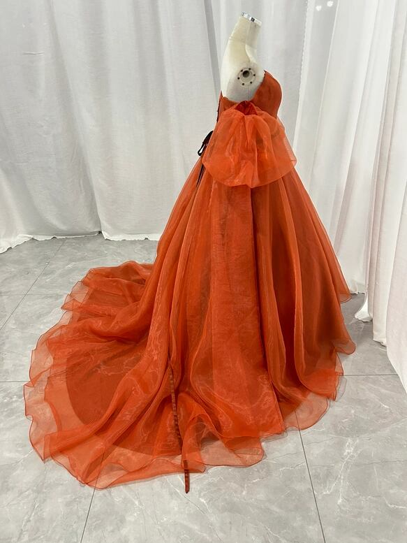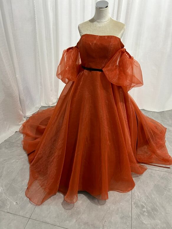 大好評中!テラコッタ色 カラードレス 上質オーガンジー パフスリーブ プリンセスライン /結婚式披露