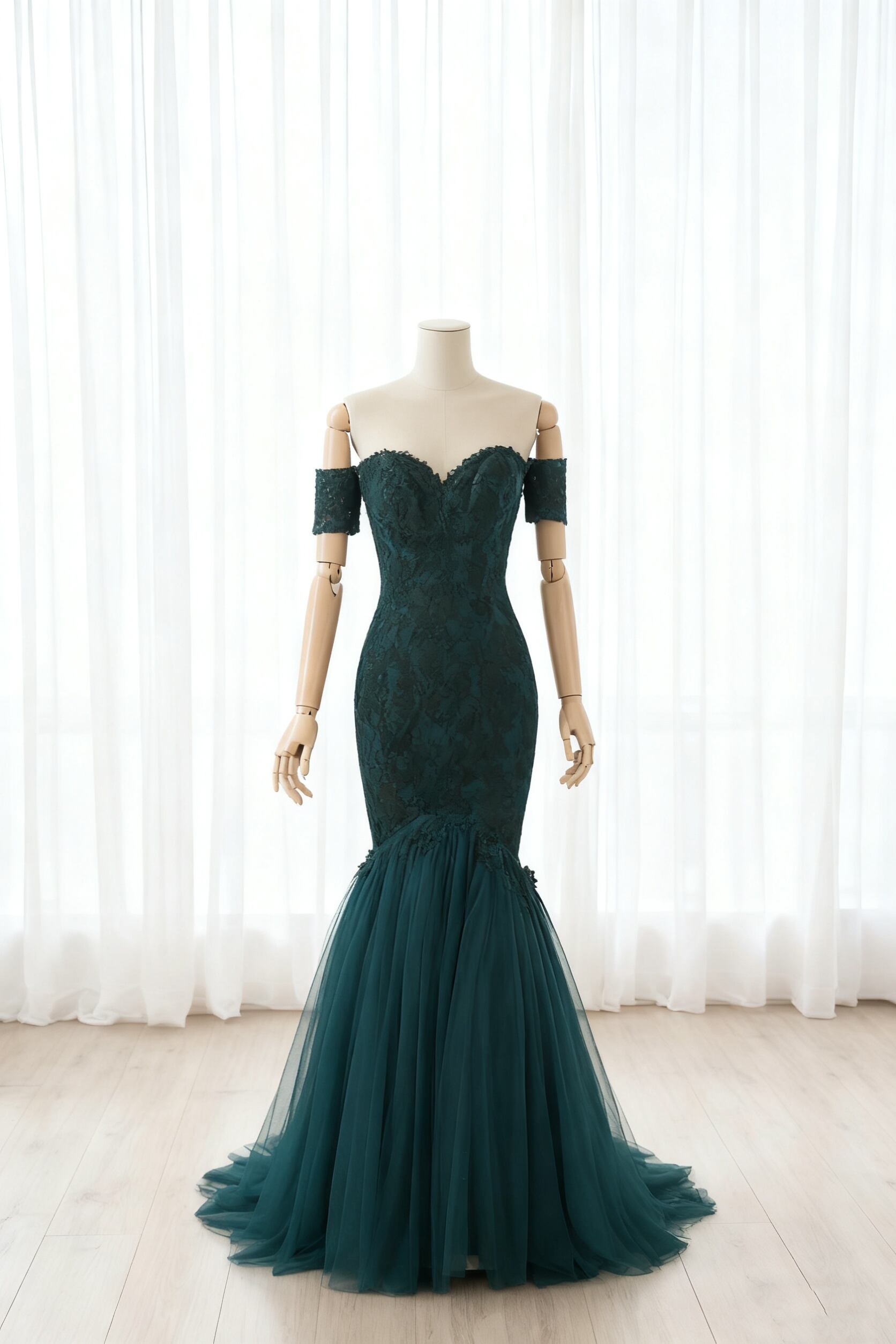 カラードレス マーメイドライン チュールスカート グリーン エレガント 繊細なレース 結婚式