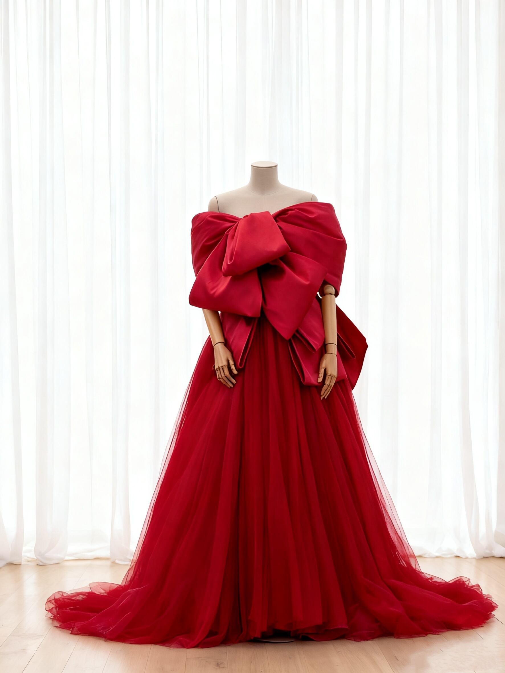 カラードレス オフショルダー リボン えんじ色 アシンメトリードレス チュールスカート 結婚式