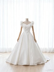 ウェディングドレス パフスリーブ Vネック 細見えシルエット Aライン スレンダーライン プリンセスライン