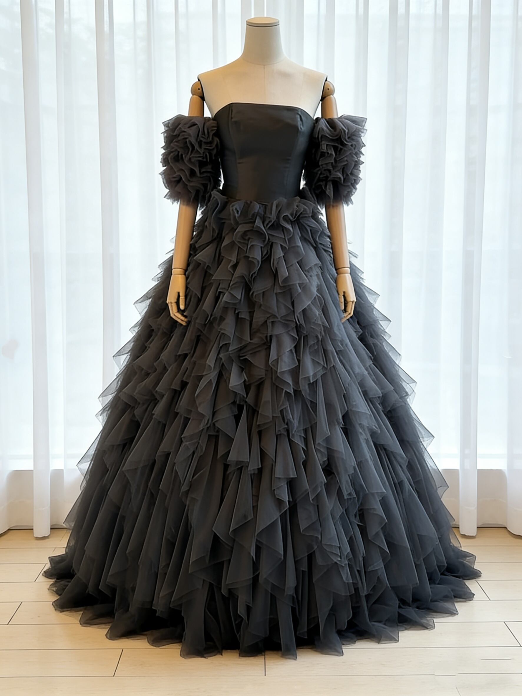 カラードレス ブラック もこもこドレス ビスチェドレス 姫袖 結婚式 チュールドレス ふわふわドレス 床付く プリンセスライン
