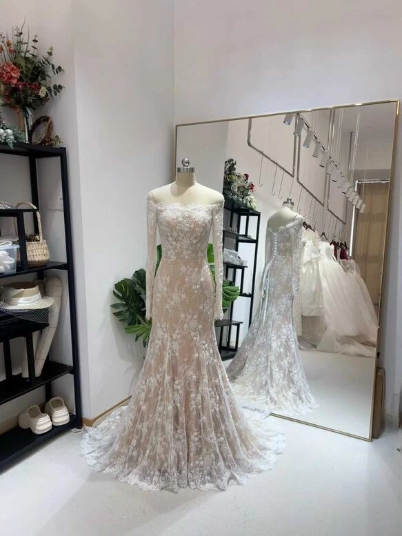 ウェディングドレス オフショルダー マーメイドライン ロングスリーブ ビーズ 贅沢な小花柄の総レース
