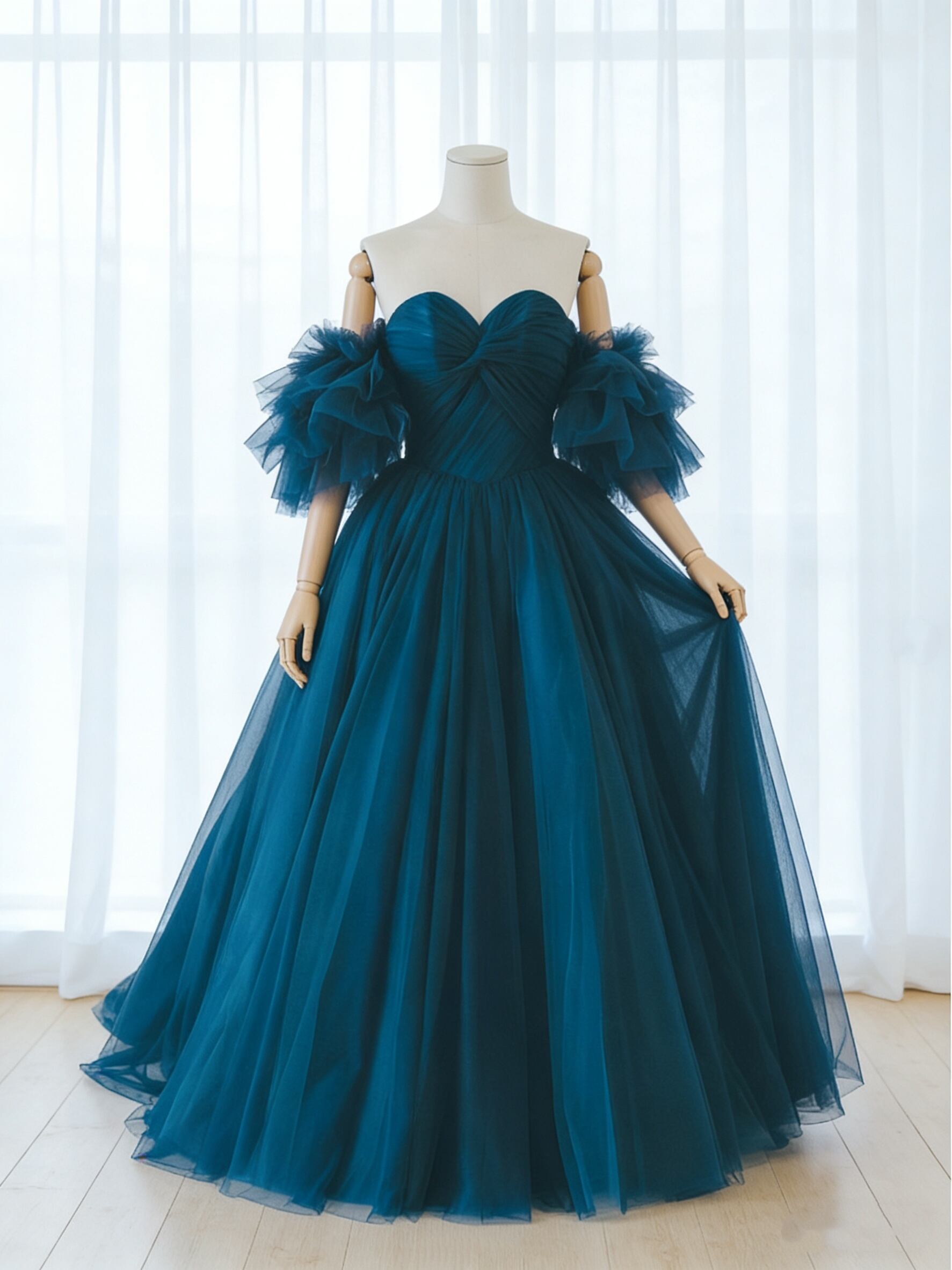 カラードレス ブルー フリル袖 スリット エレガント アンティークなドレス 柔らかく重ねたチュールスカート