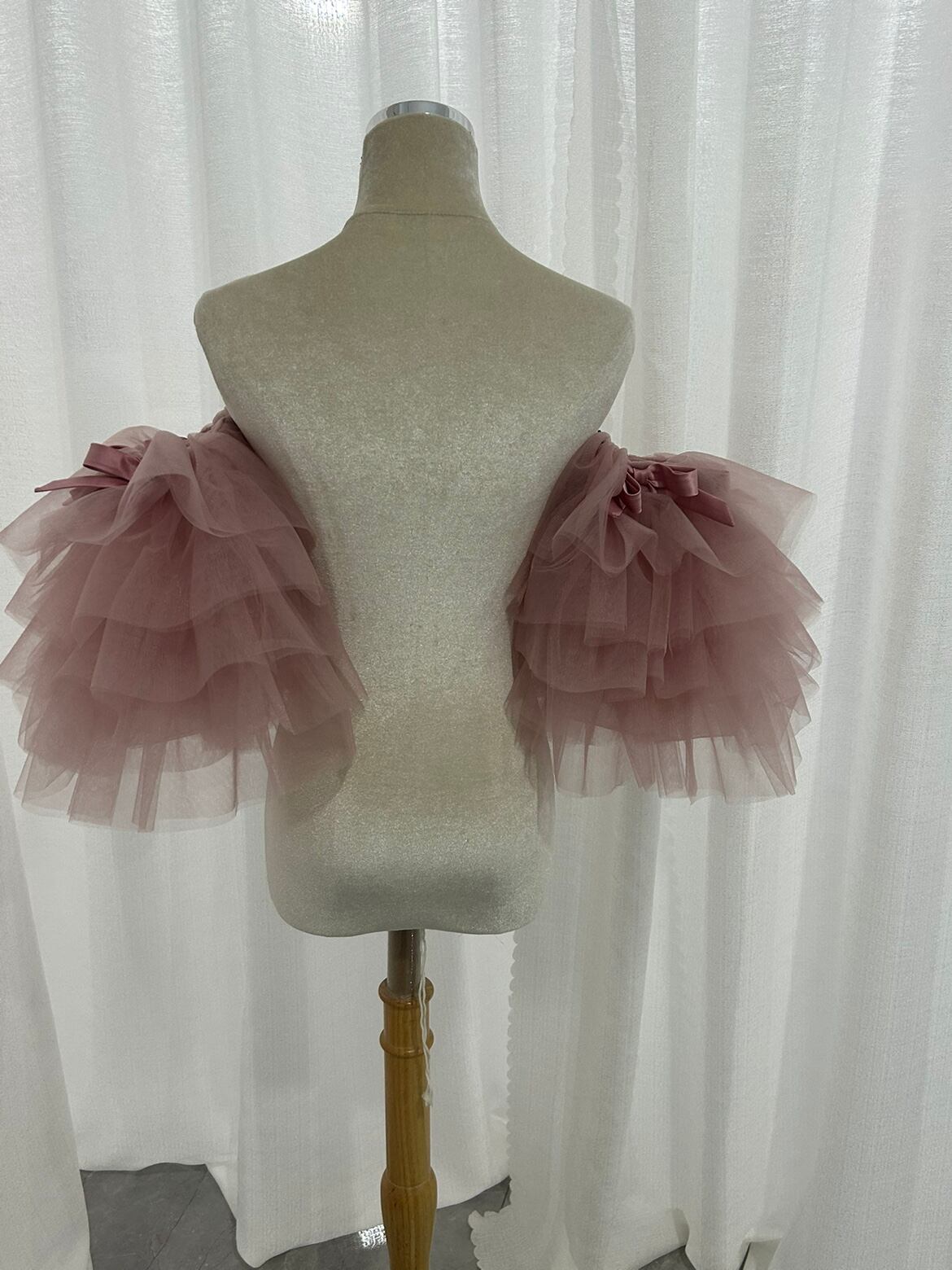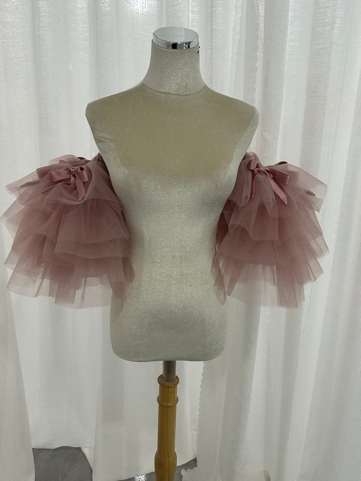 取り外し可能な付け袖 薄ピンク リボン ストレッチ 姫袖 パフスリーブ ソフトチュール 花嫁