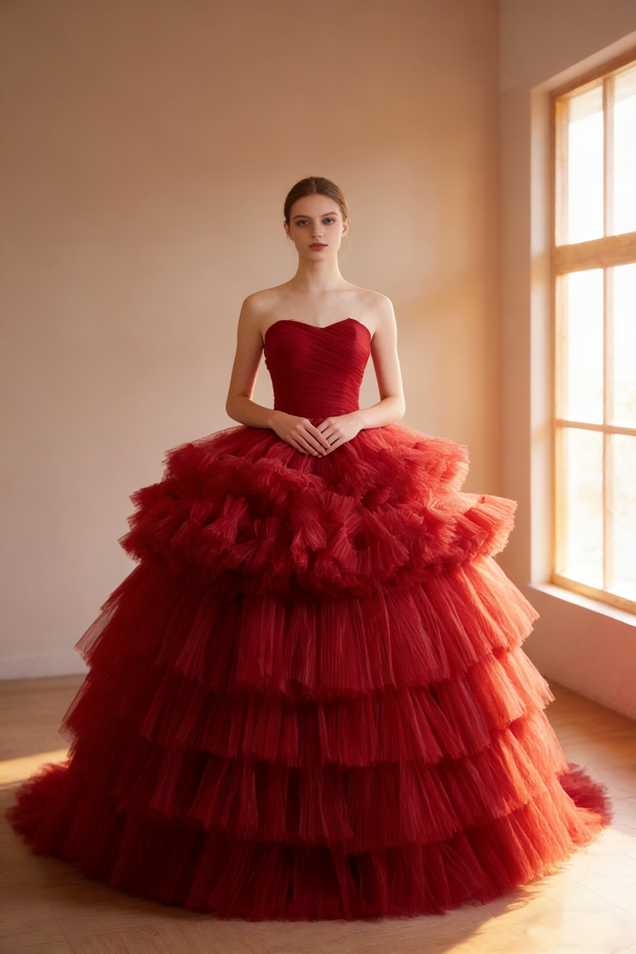 カラードレス ベアトップ ボルドー色 フレアスカート プリーツドレス ロング プリンセスライン エレガント