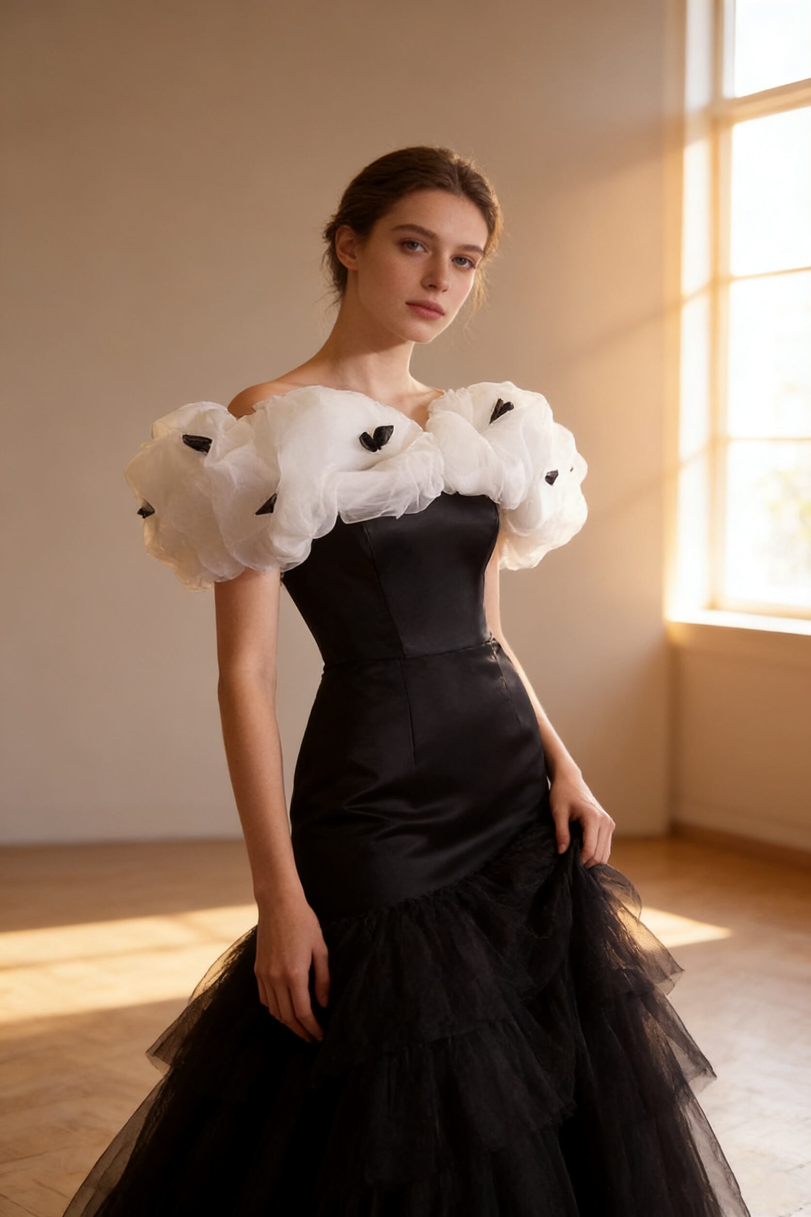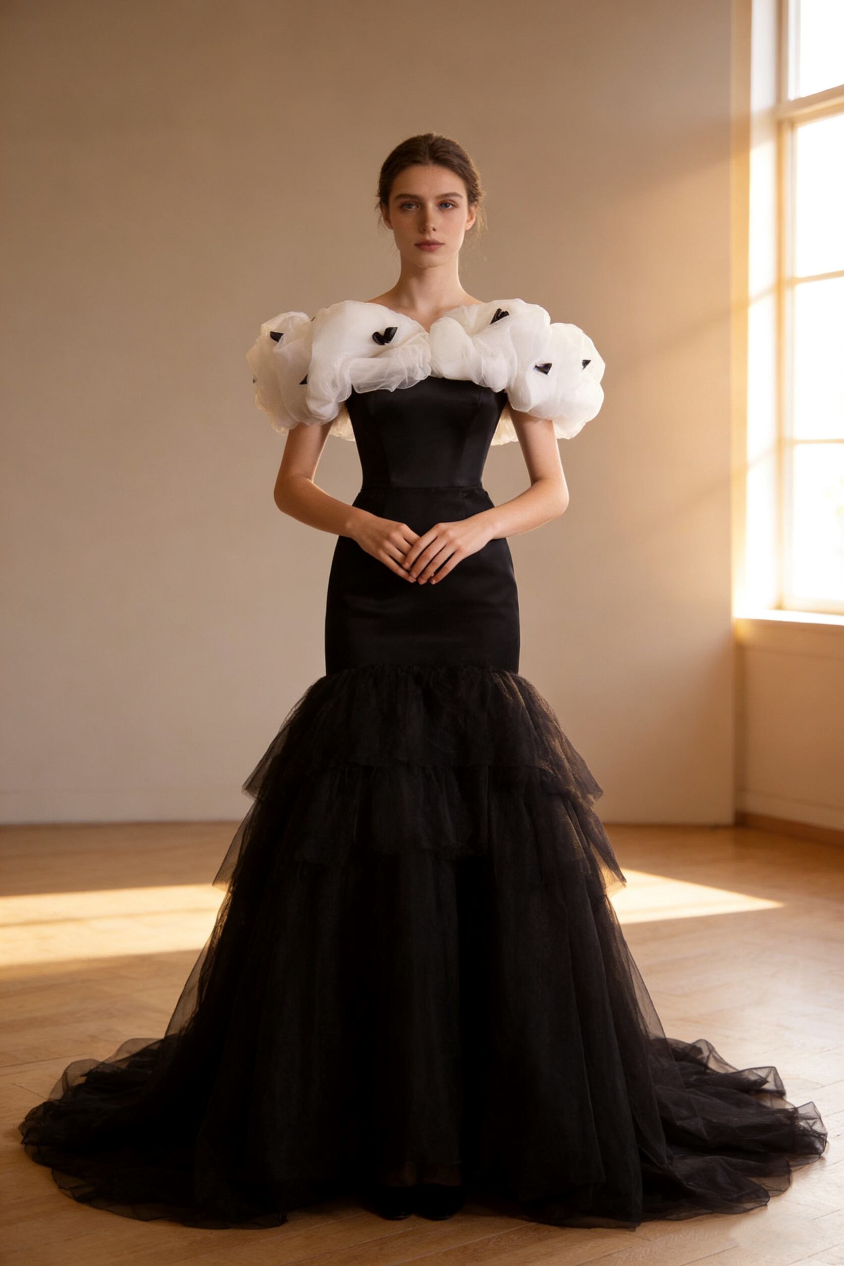 カラードレス ブラック マーメイドライン オフショルダー チュールスカート 前撮り 二次会 優雅なシルエット アシンメトリードレス
