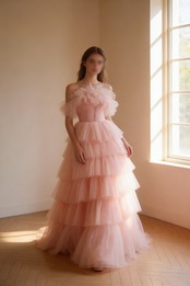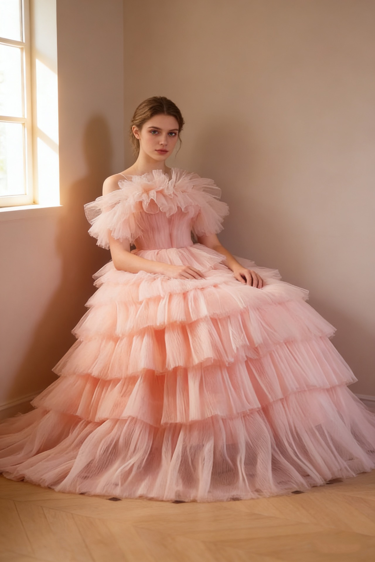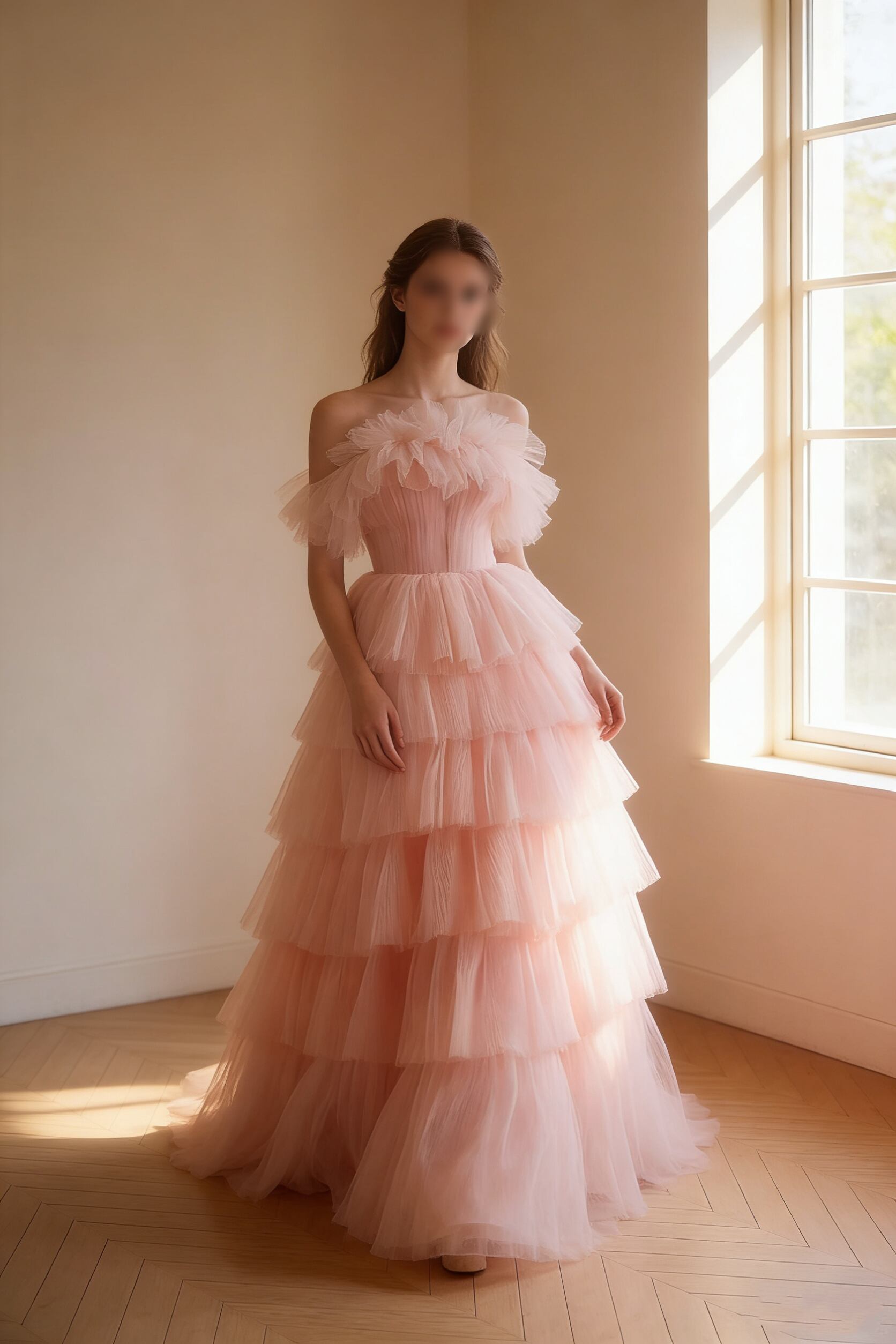 カラードレス ピンク オフショルダー ティアードのドレス プリーツドレス プリンセスライン 結婚式 ソフトチュール オーダーメイド可能