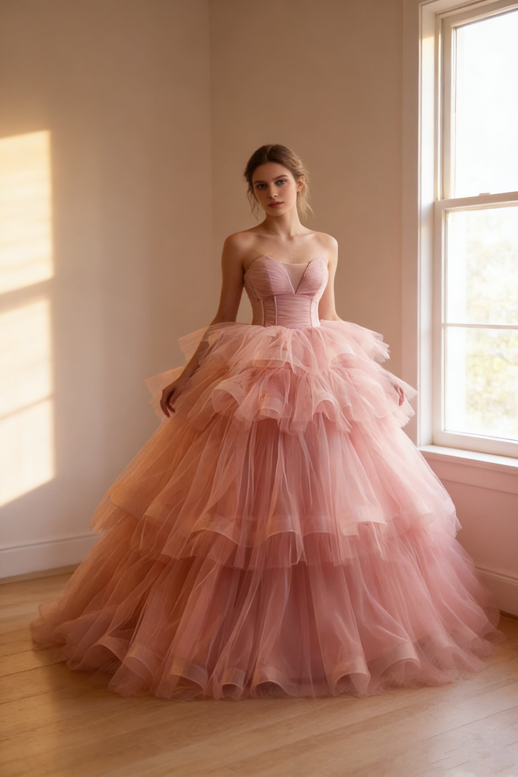 カラードレス ベアトップ ティアードのドレス フレアスカート ピンク パーティーワンピース 結婚式