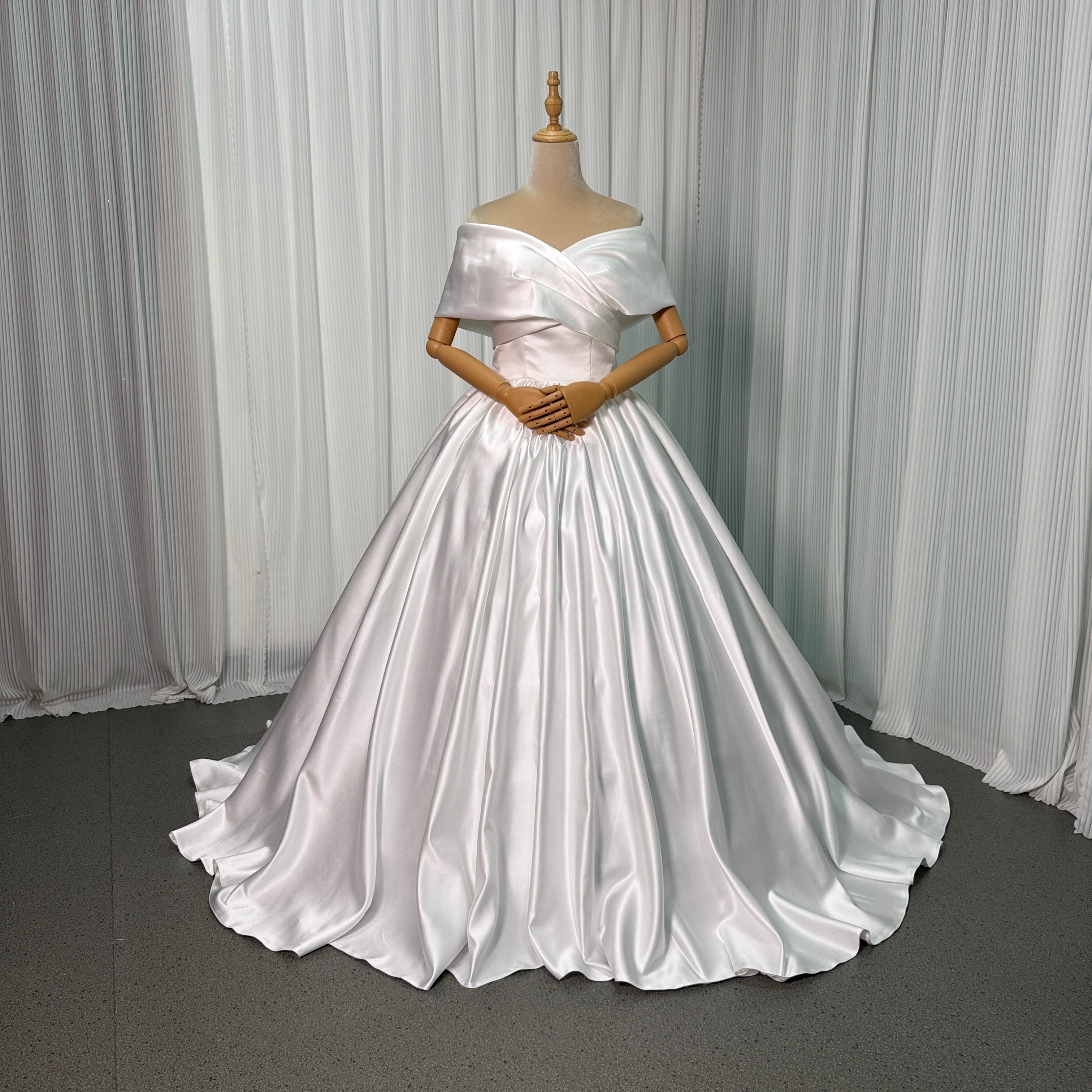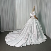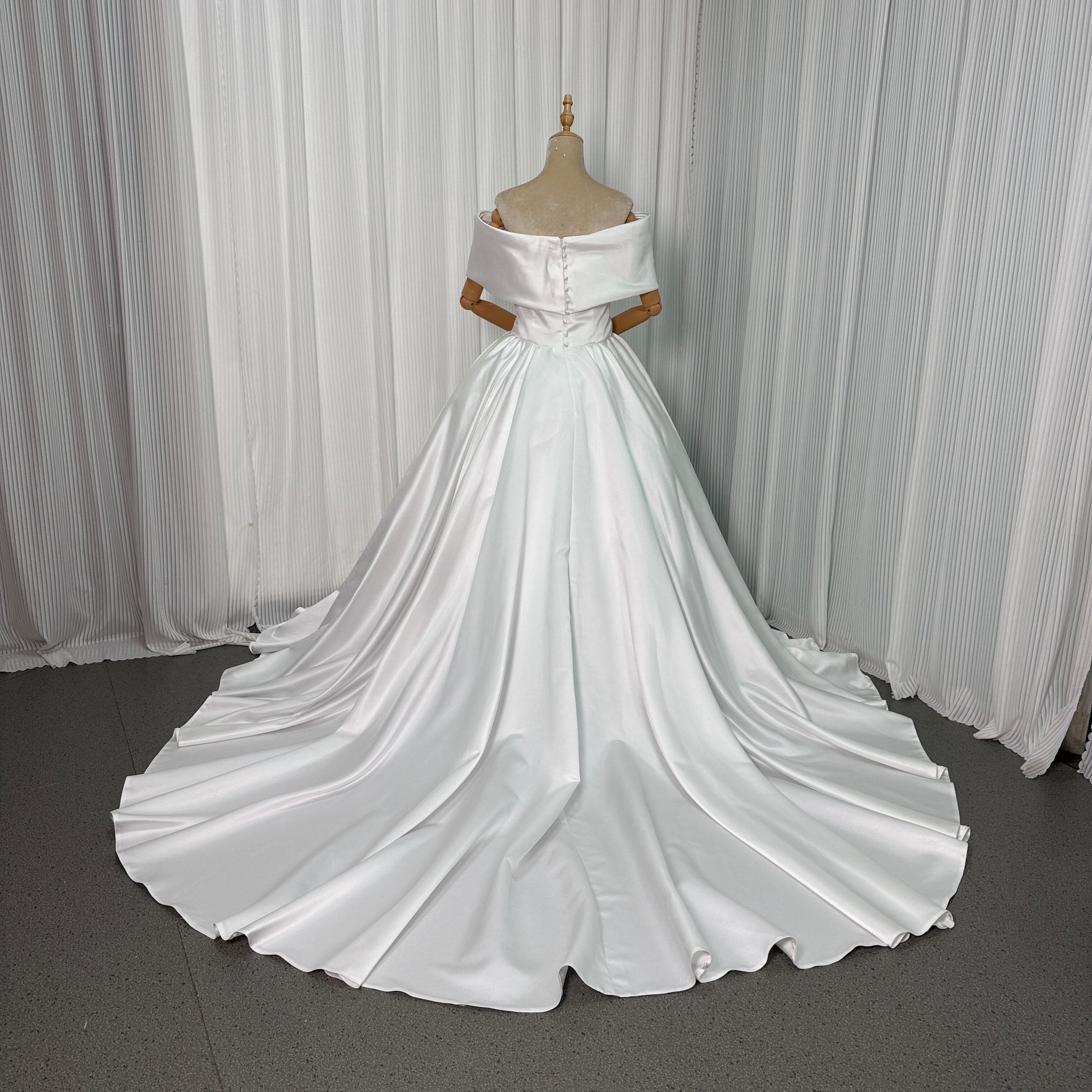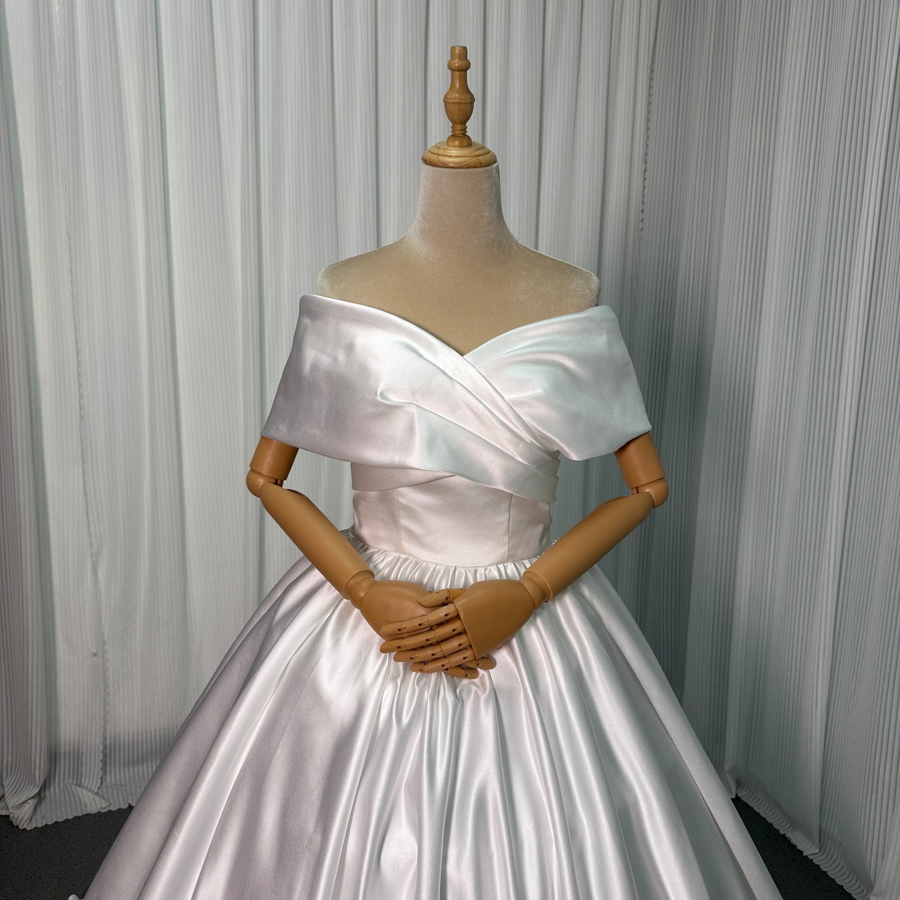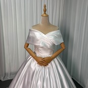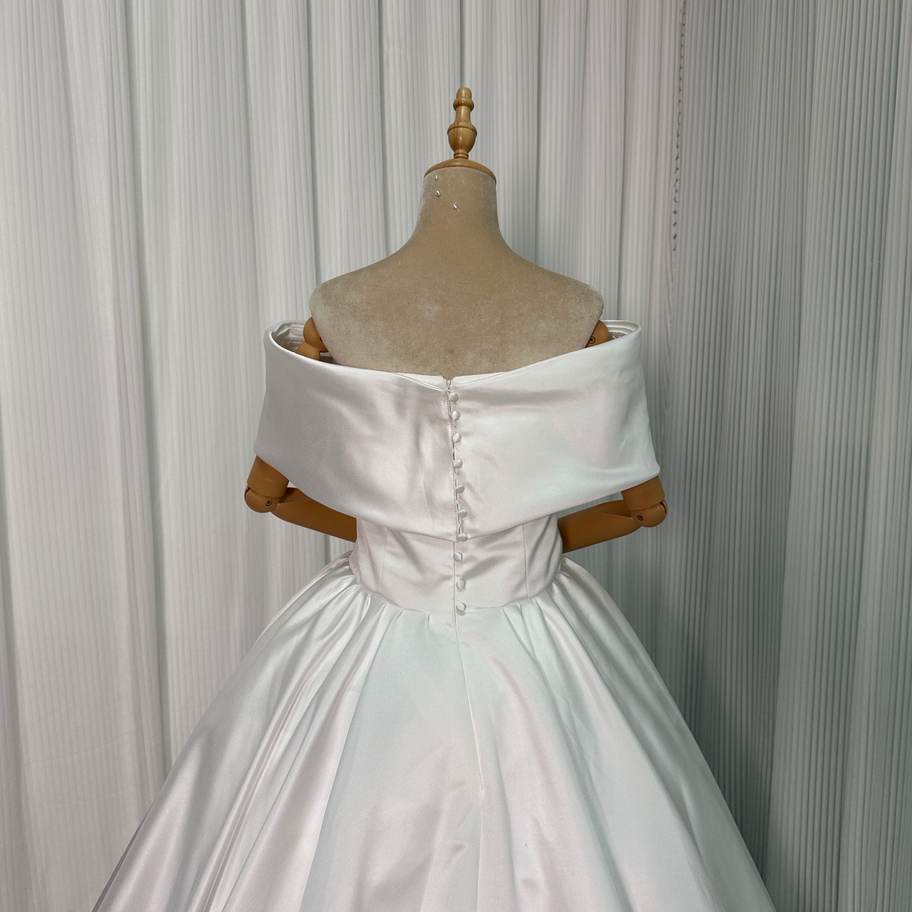 ウェディングドレス オフショルダー 光沢サテン くるみボタン オフホワイト スレンダーライン 披露宴