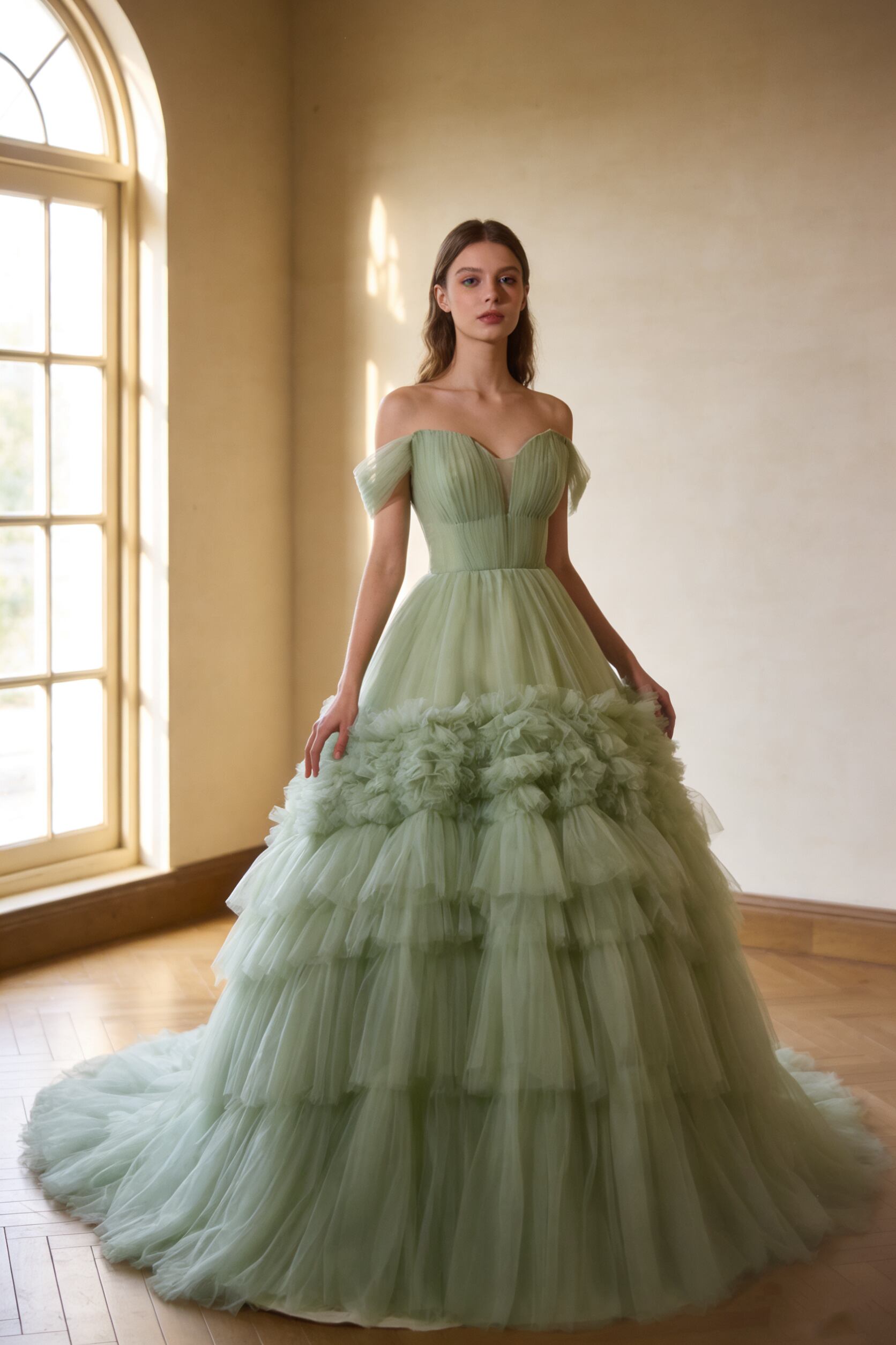 カラードレス グリーン オフショルダー 前撮り オーダーメイド可能 ハンドドレープ もこもこドレス パーティドレス