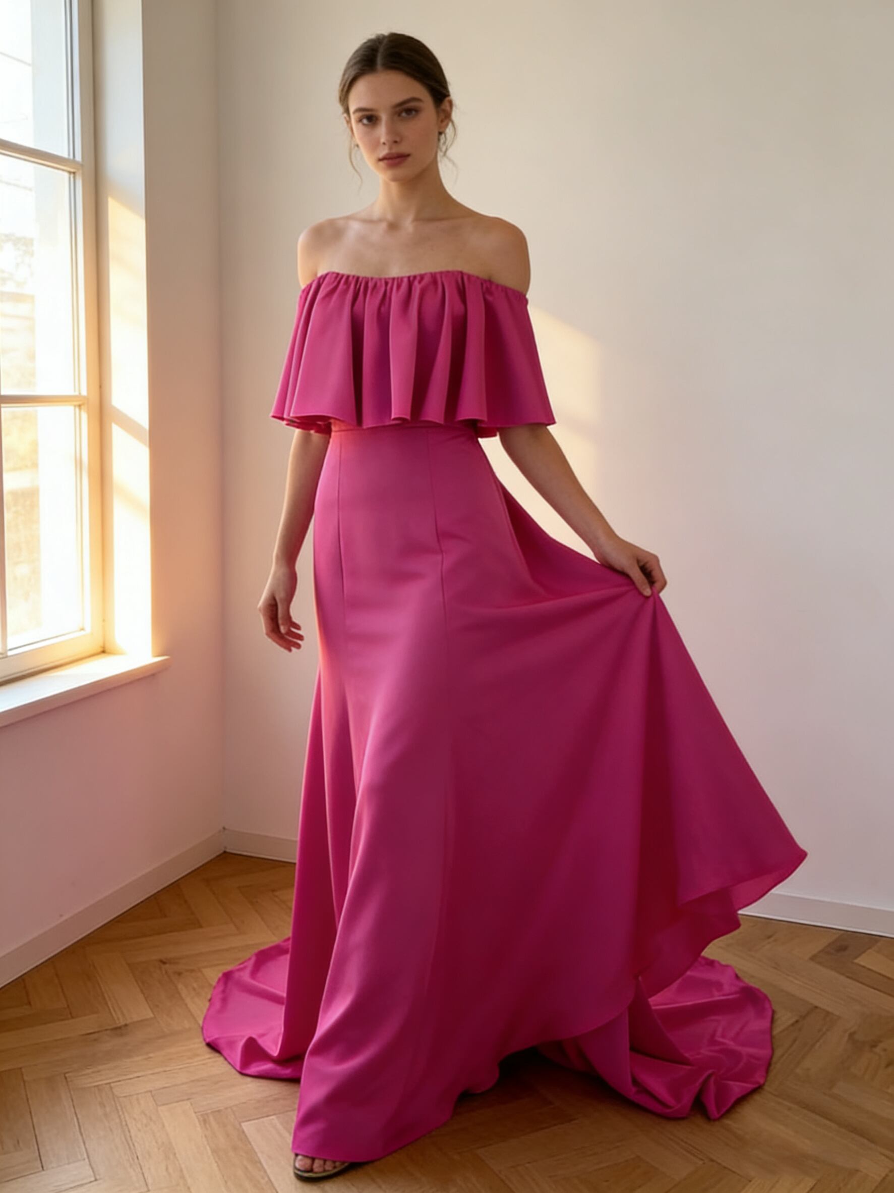 パーティードレス オフショルダー ビビッドピンク マーメイドライン 前撮り スリット