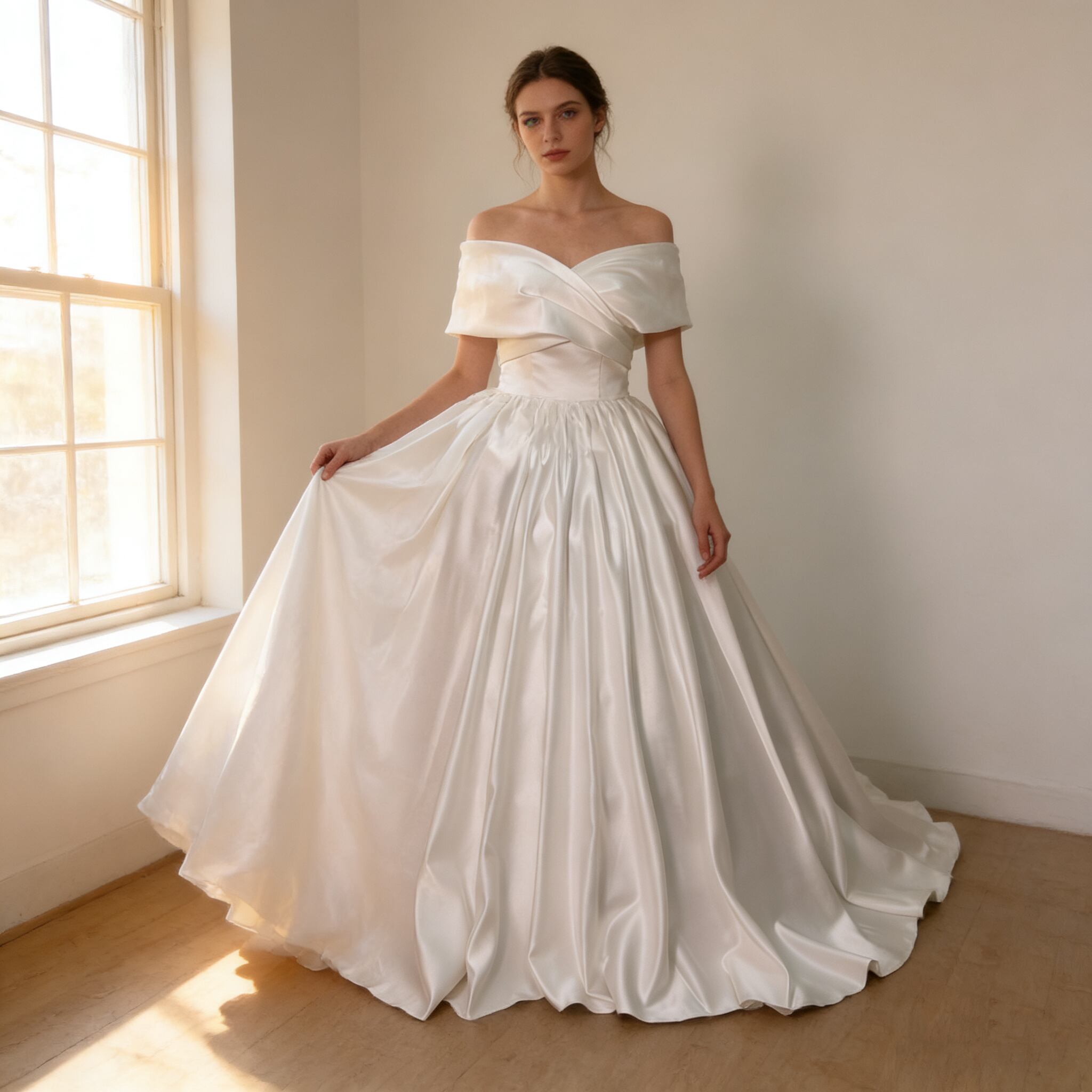 ウェディングドレス オフショルダー 光沢サテン くるみボタン オフホワイト スレンダーライン 披露宴
