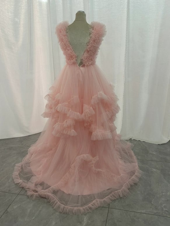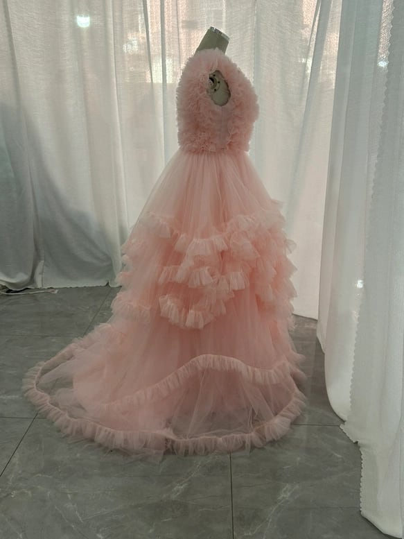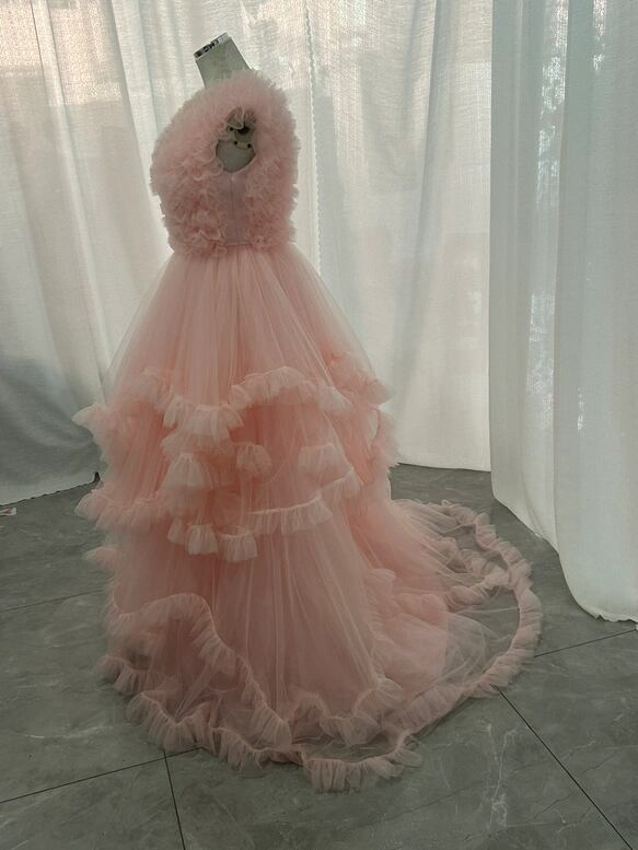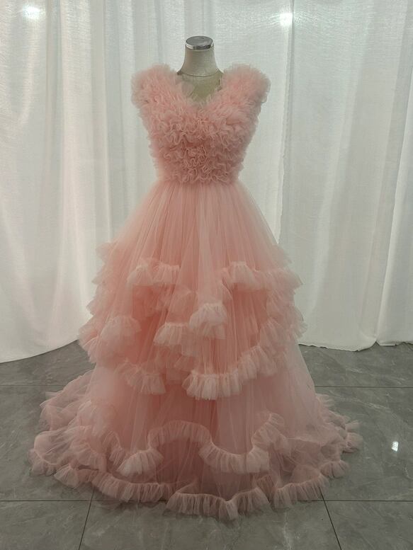 カラードレス 薄桃色 ラッフルフリル ソフトチュール ノースリーブ ボリュームドレス 可愛い 前撮り